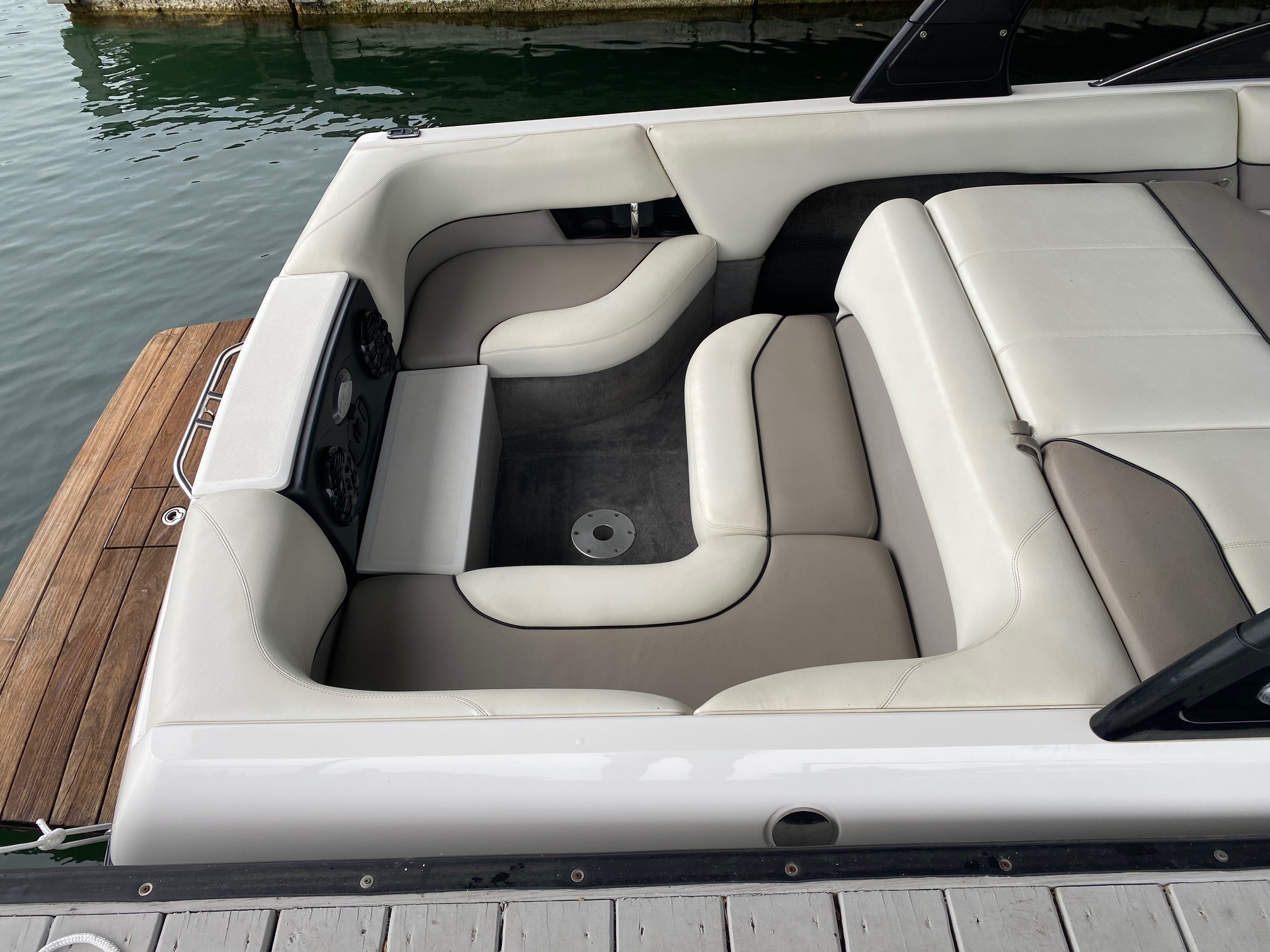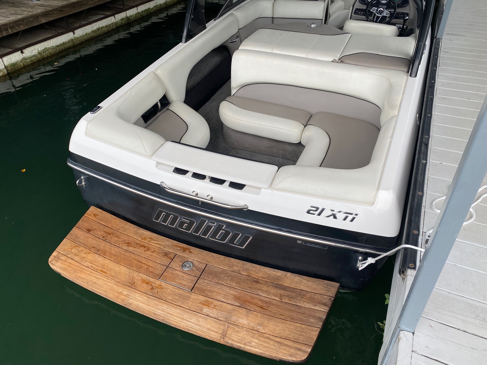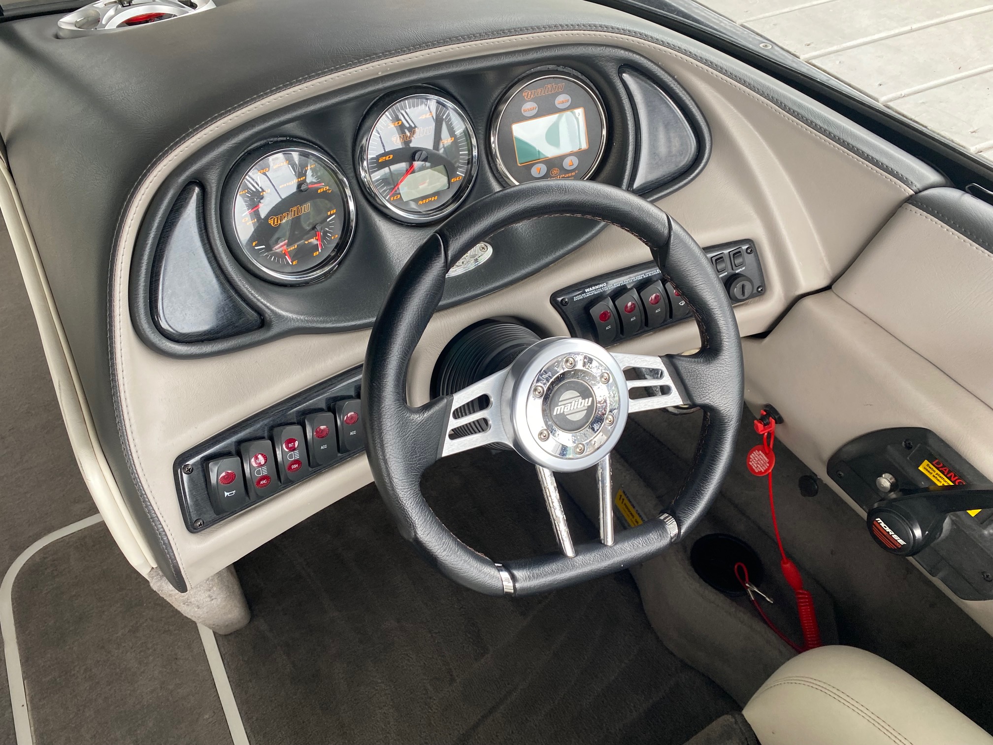 Features include: Perfect Pass cruise control, Illusion tower with tower speakers and bimini top, tournament ski pylon, Bluetooth stereo, in-floor ski locker, teak swim platform, Malibu Wedge for wakeboarding and surfing, full Malibu travel cover, and single axle trailer with surge brakes.