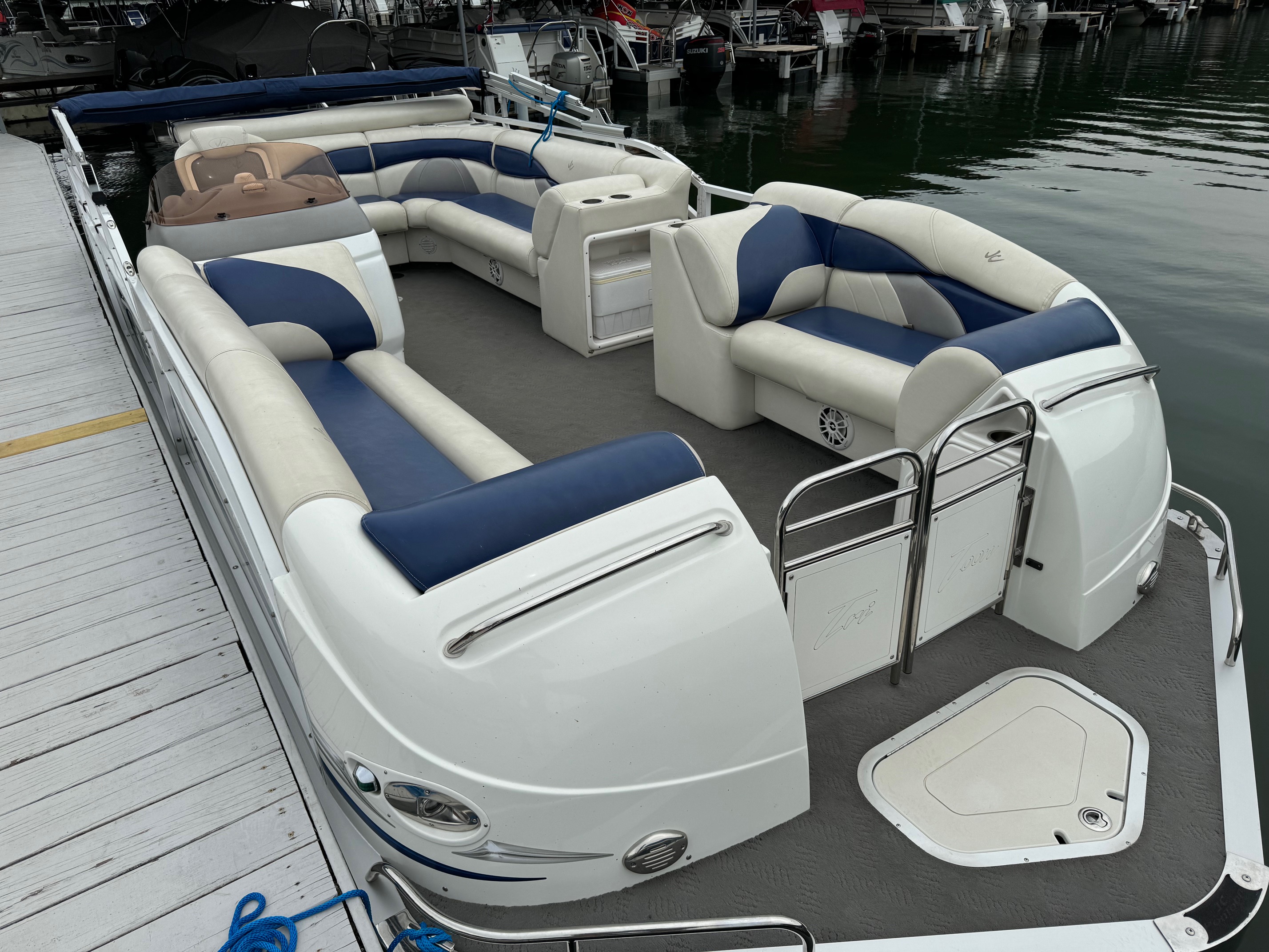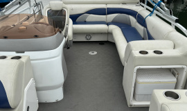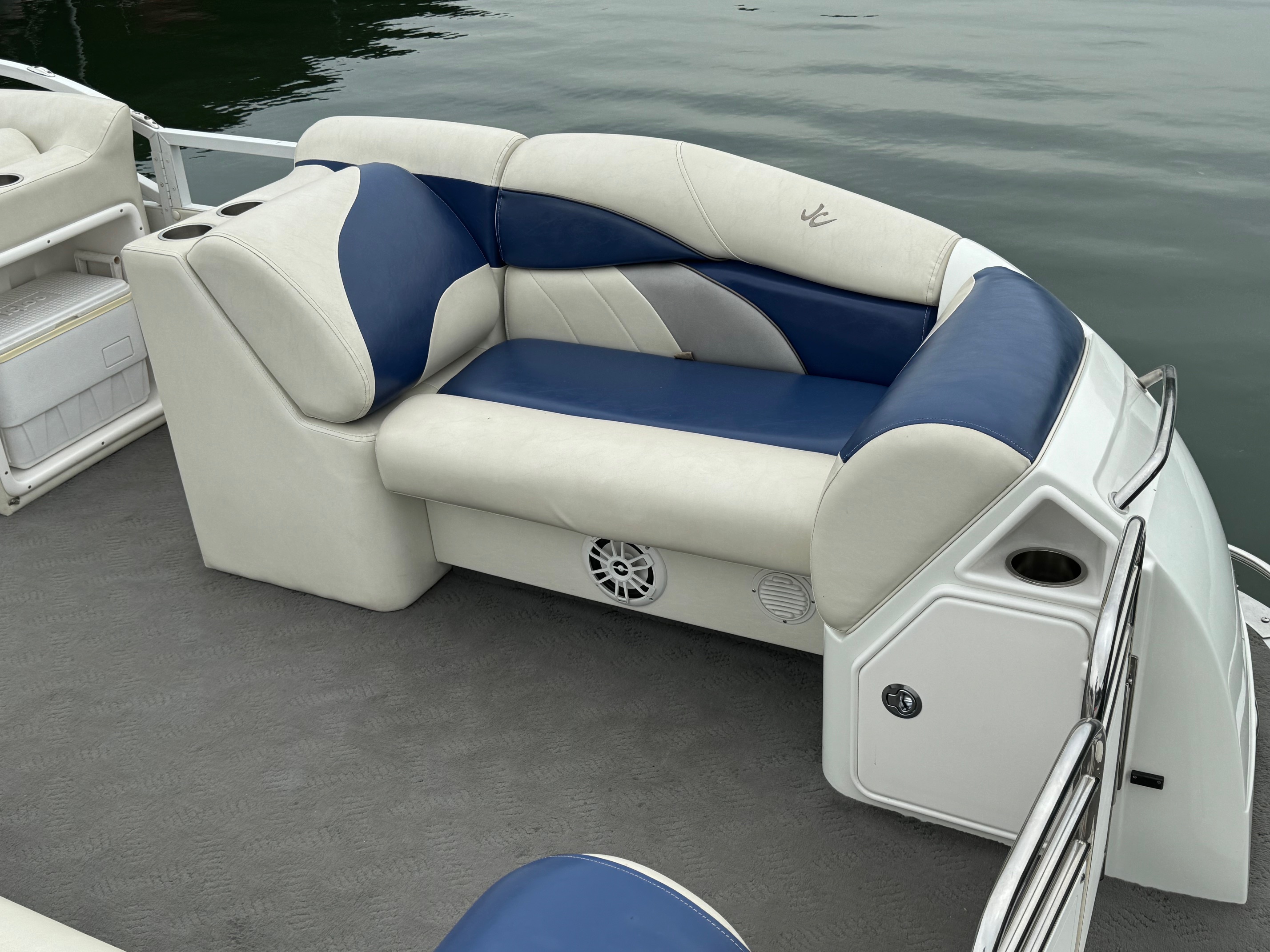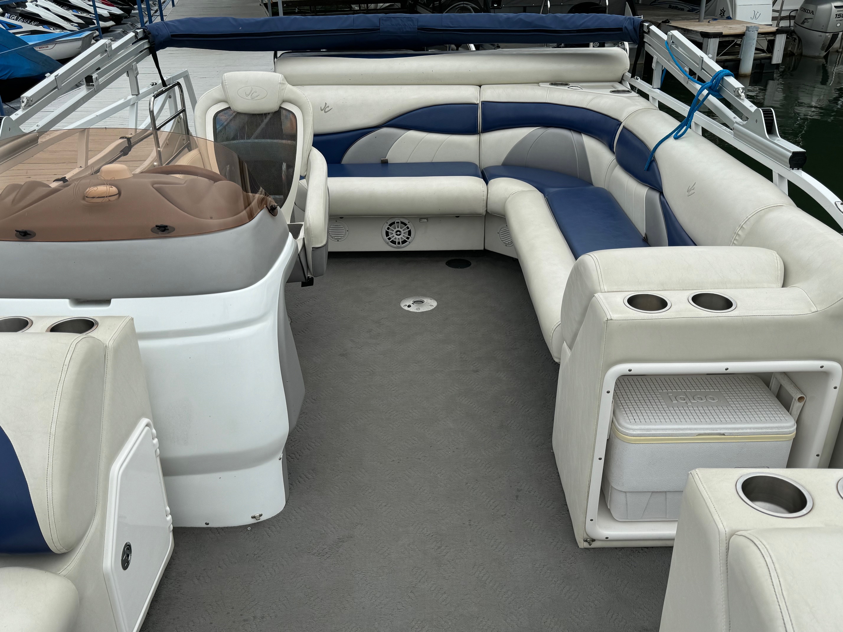 Excellent condition JC with only 195 hours on the Honda 225! This boat utilizes JC’s TriToon Classic hull with 3′ wide center tube and asymmetrical port and starboard tubes for incredible rough water performance. Other features include: Hydraulic steering, Upgraded Simrad color GPS/fish finder, Bluetooth stereo with upgraded speakers, under-seat blue LED courtesy lights, Upgraded electric bimini top, full cover, stainless ski tow and swim ladder, Visionair Captain’s chair with flip up bolster, bow anchor locker, and lounger back seats with trash container.