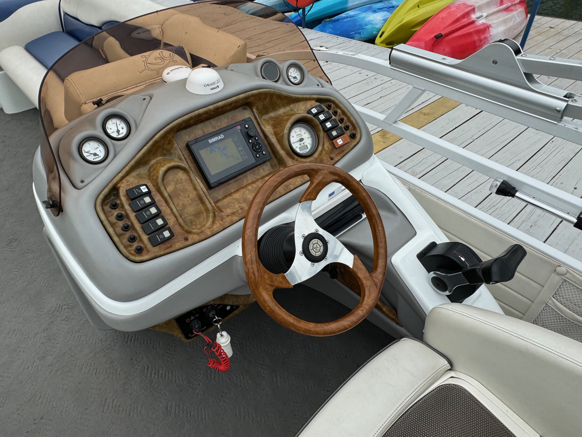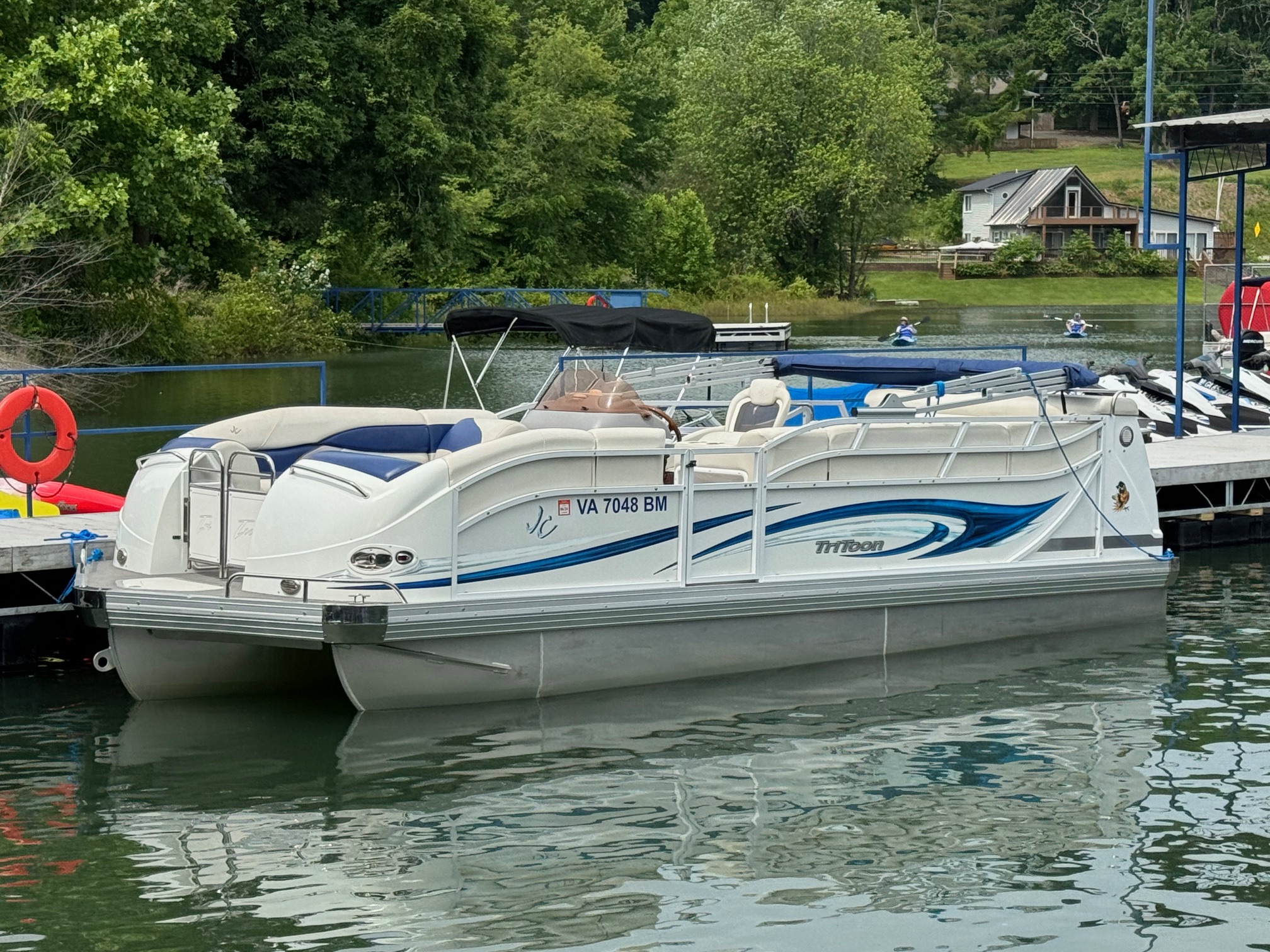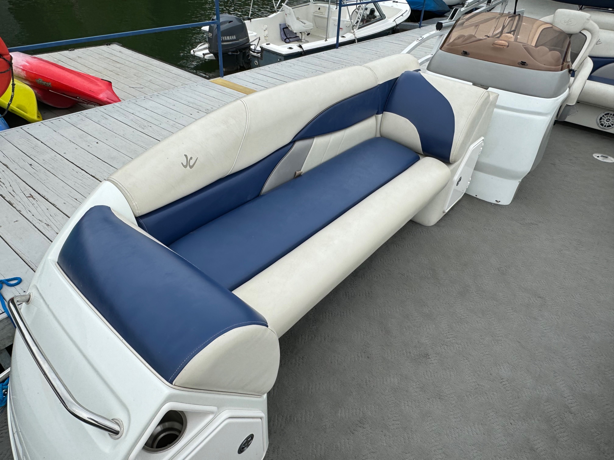 Excellent condition JC with only 195 hours on the Honda 225! This boat utilizes JC’s TriToon Classic hull with 3′ wide center tube and asymmetrical port and starboard tubes for incredible rough water performance. Other features include: Hydraulic steering, Upgraded Simrad color GPS/fish finder, Bluetooth stereo with upgraded speakers, under-seat blue LED courtesy lights, Upgraded electric bimini top, full cover, stainless ski tow and swim ladder, Visionair Captain’s chair with flip up bolster, bow anchor locker, and lounger back seats with trash container.