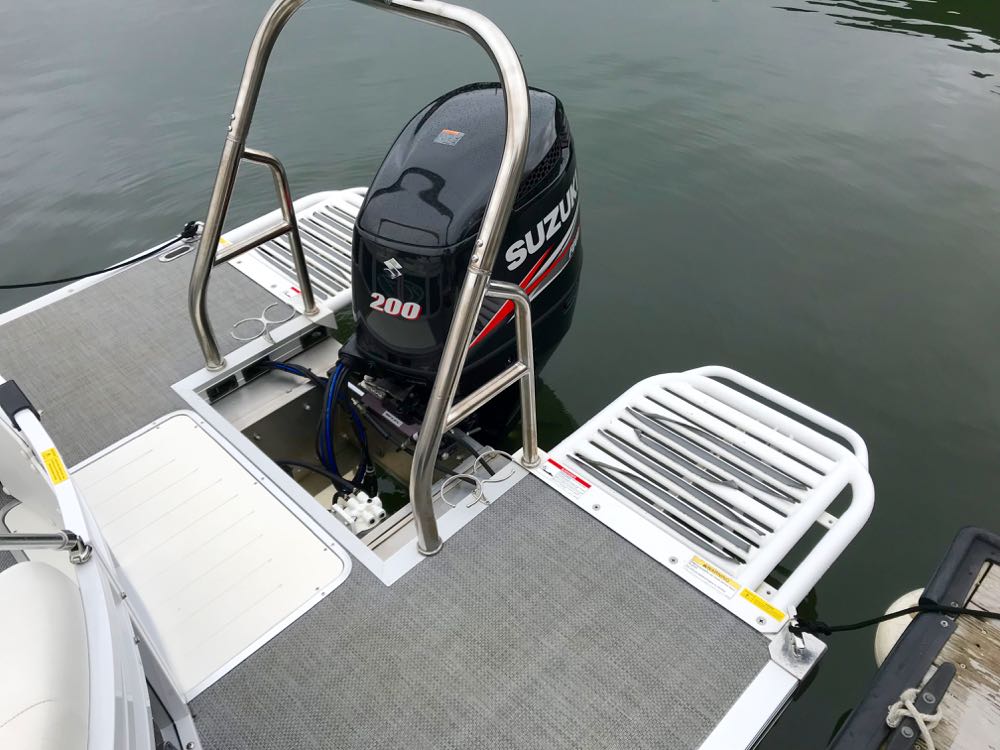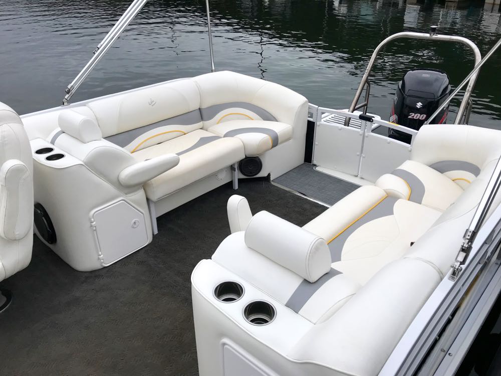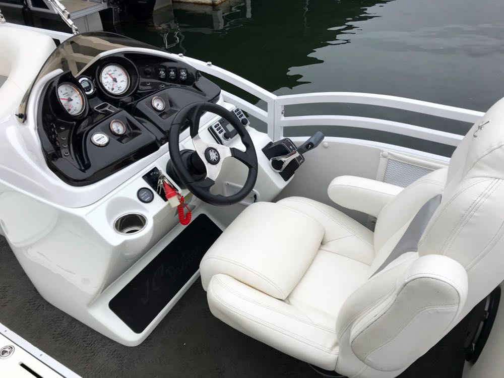 Very nice condition 2013 JC TriToon SunLounger 25TT. Deck length: 25’7″. Equipped with Suzuki 200 V6 fuel-injected 4-Stroke, JC’s hydro-performance Sport Hull, power-assist hydraulic steering, dual powder-coated swim platforms, stainless swim ladder, stainless heavy-duty ski tow, Clarion stereo with Clarion speakers, subwoofer, and amp. Also includes double Sunbrella bimini tops, Sunbrella full mooring cover, in-deck ski and wake storage, slide out lounges bow and stern, moveable bow gate seat that can be placed bow or stern, cocktail table, deluxe helm, high-back Captain’s chair with flip-up bolsters, and stainless cupholders. Trailer not included, but we can offer delivery or new trailers for sale. This is a great deal on a gently used JC!