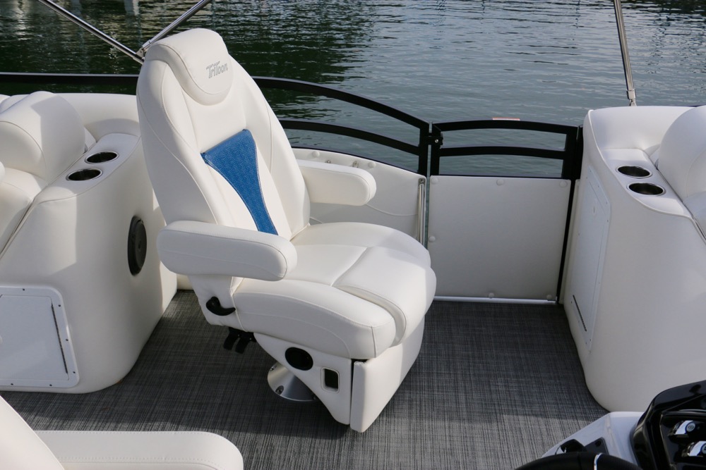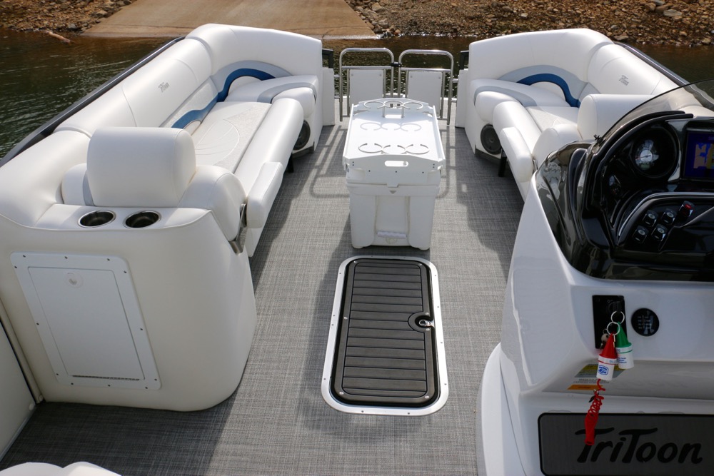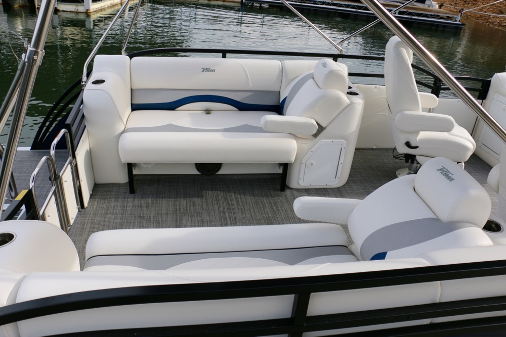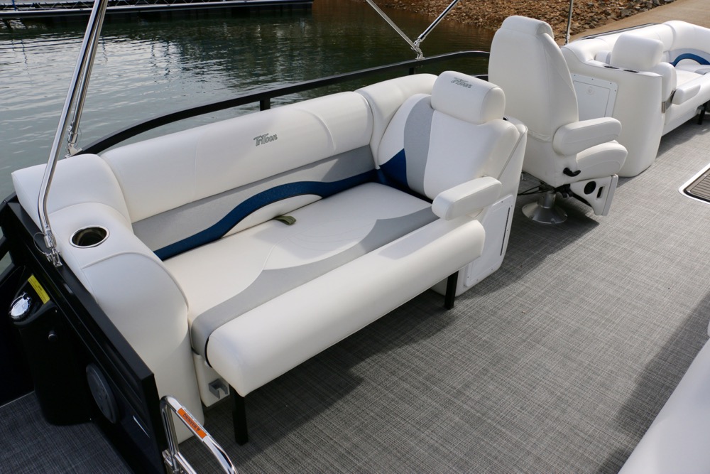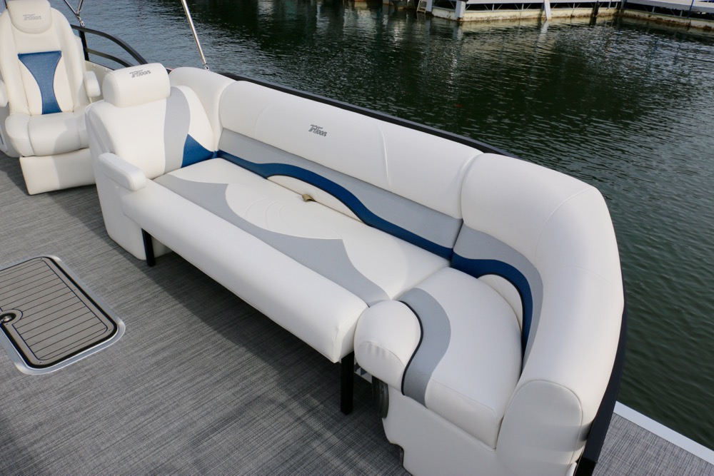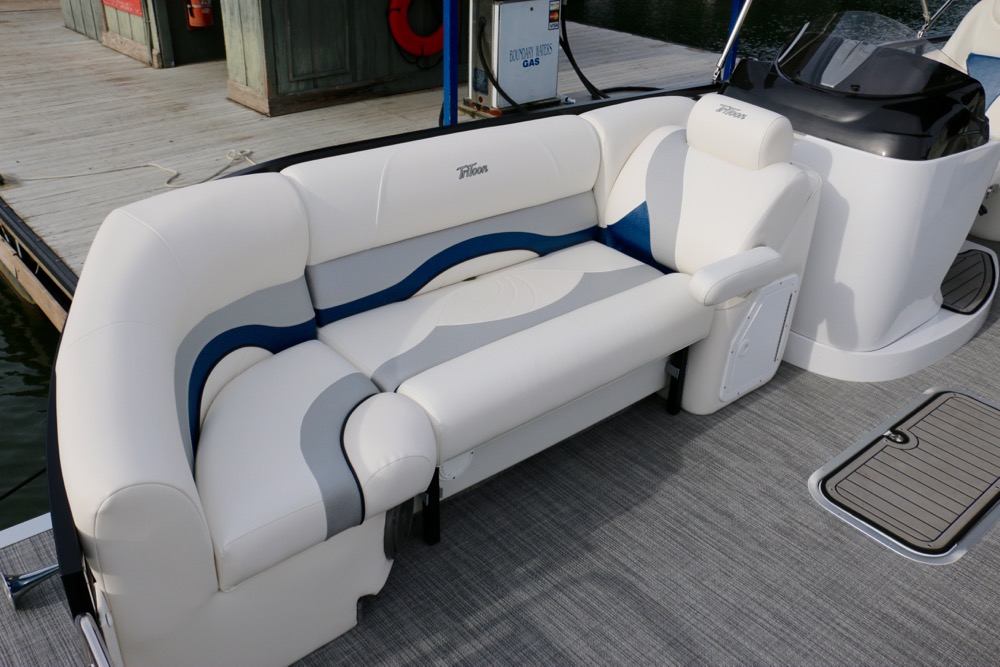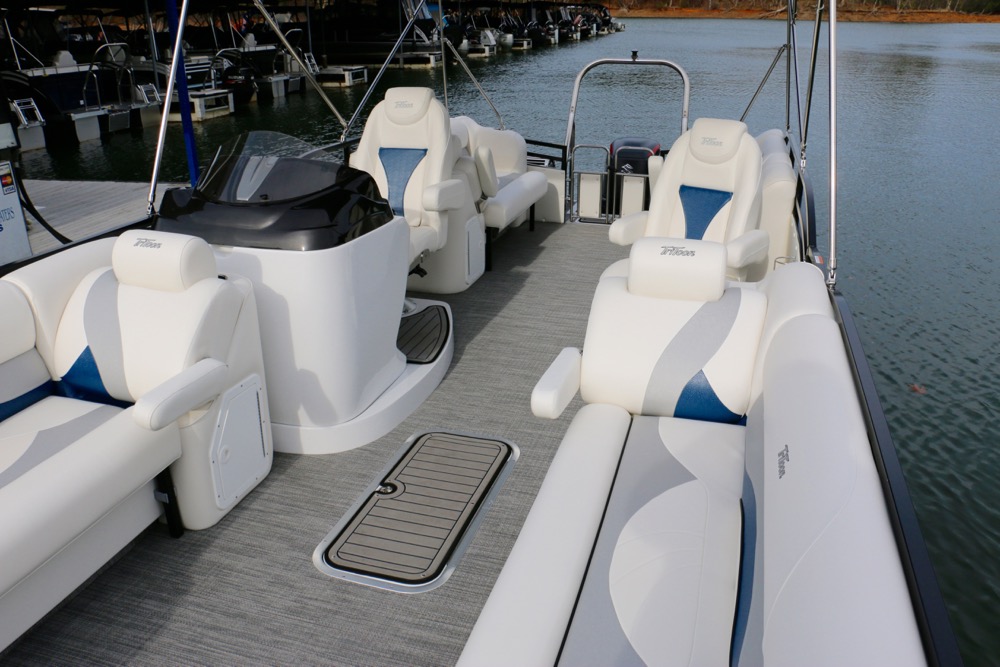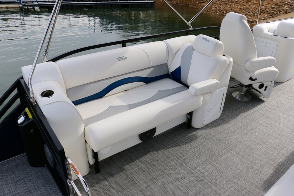 This new NepToon Sport TriToon features JC’s high-performance Sport Hull with hydro-performance fins, aluminum underskin, and power-assist hydraulic steering. On the topside, you’ll find JC’s new Dual Stern Lounge Seating! The perfect cruising and lounging configuration, with reclining captain’s chair with leg support on the port side and a reclining Captain’s chair with flip-up bolster behind the helm. Behind the twin Captain’s chairs, you’ll find 2 adjustable width rear-facing lounges to relax and watch the lake. This is also a great configuration to watch tubing, wake boarding and watersports behind the boat.