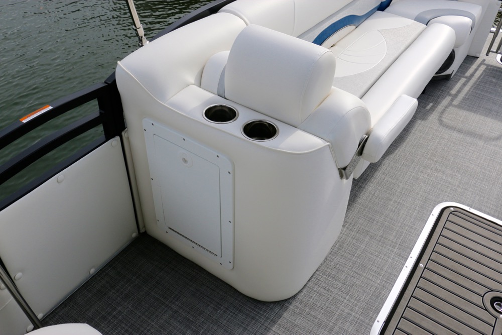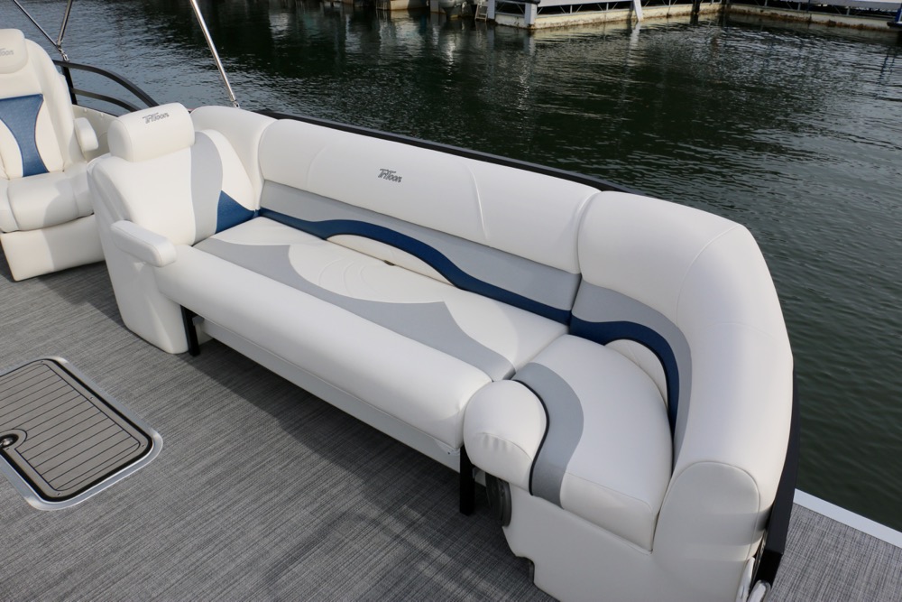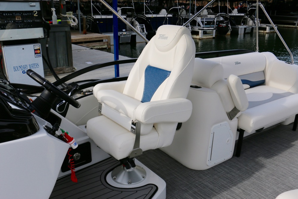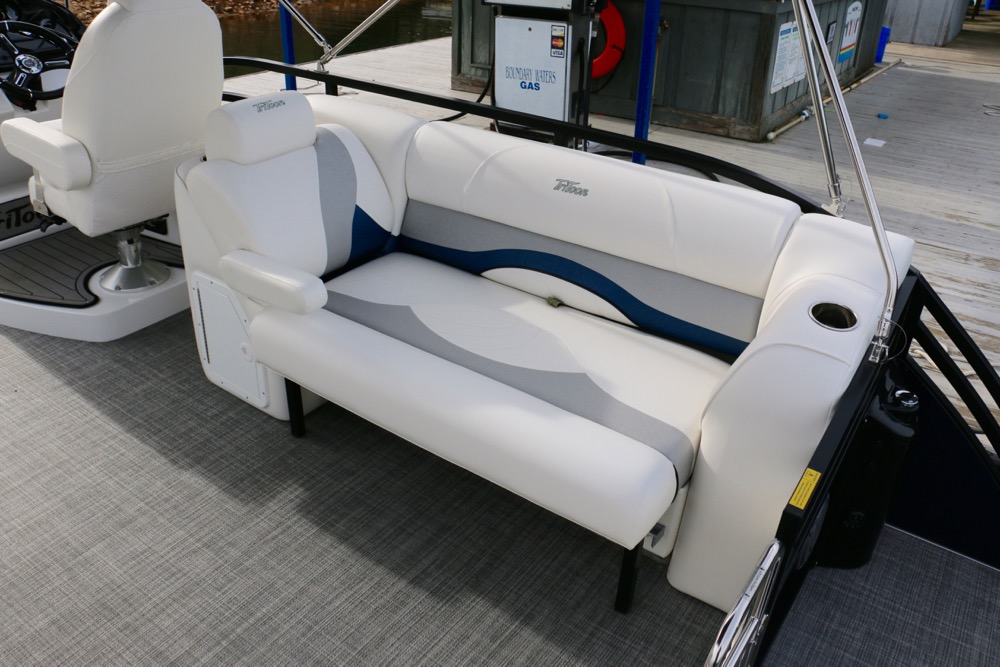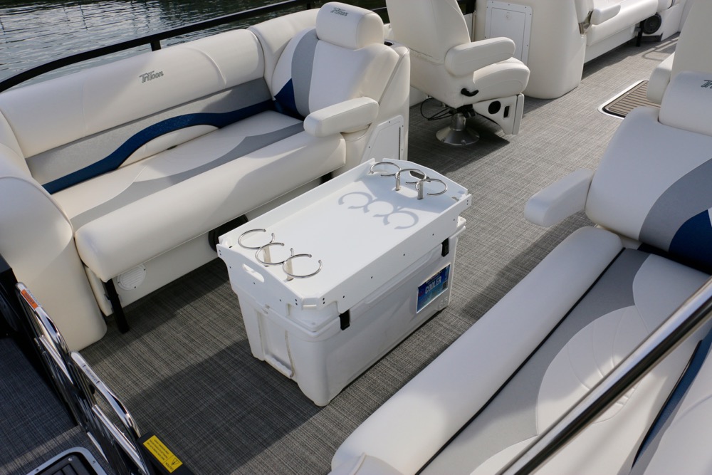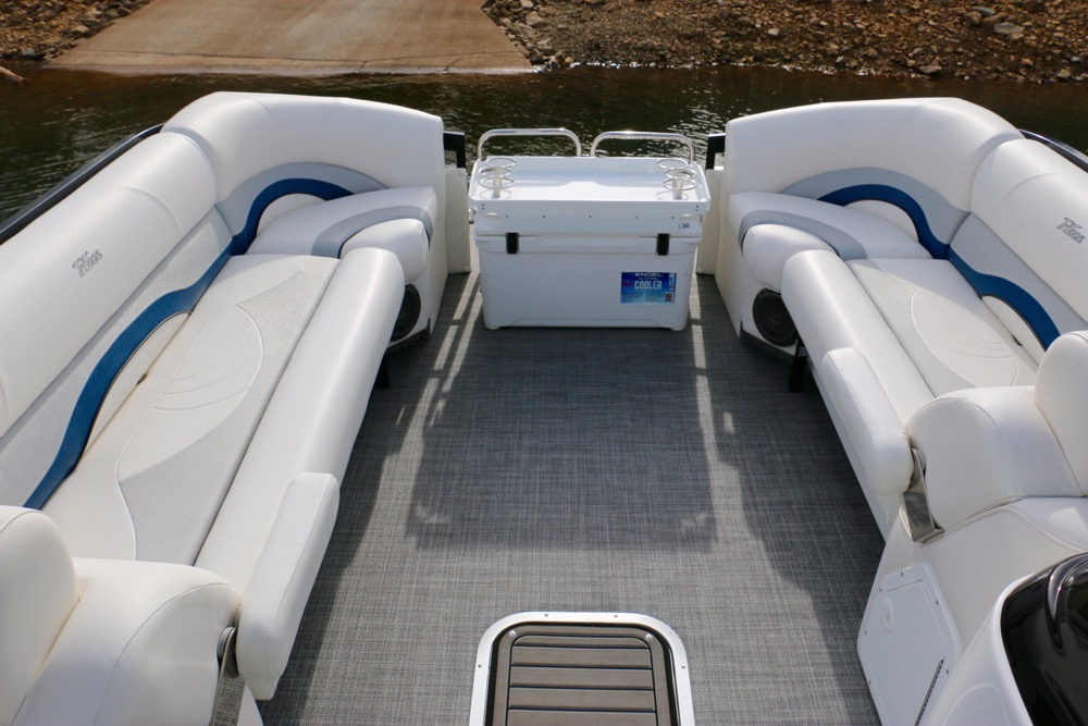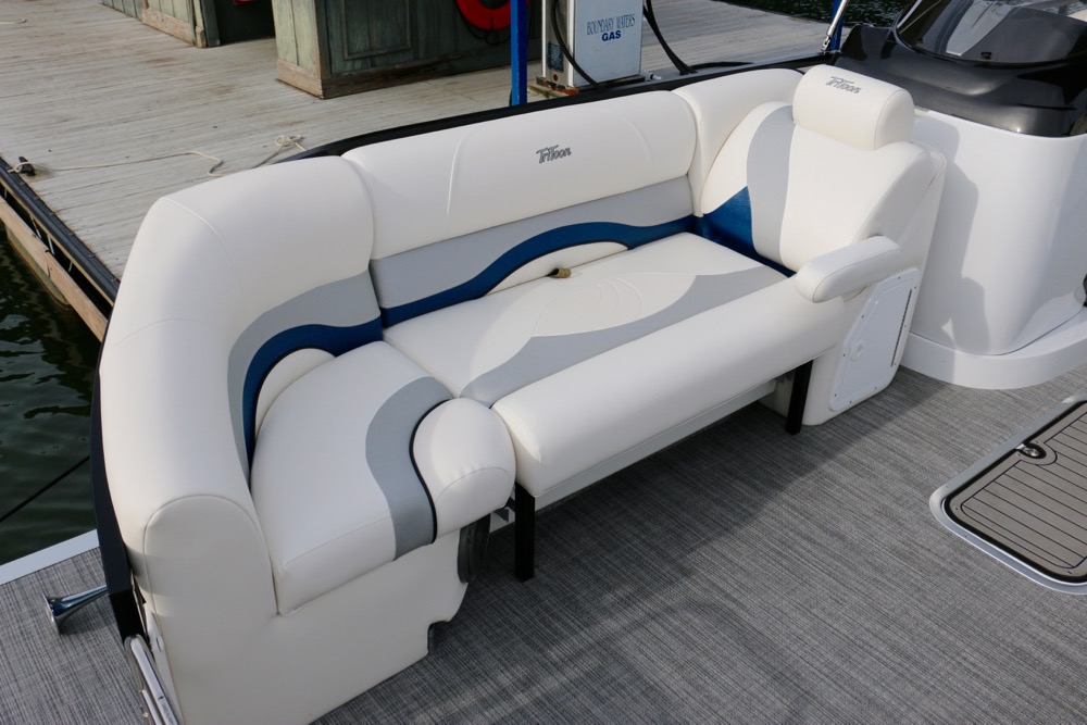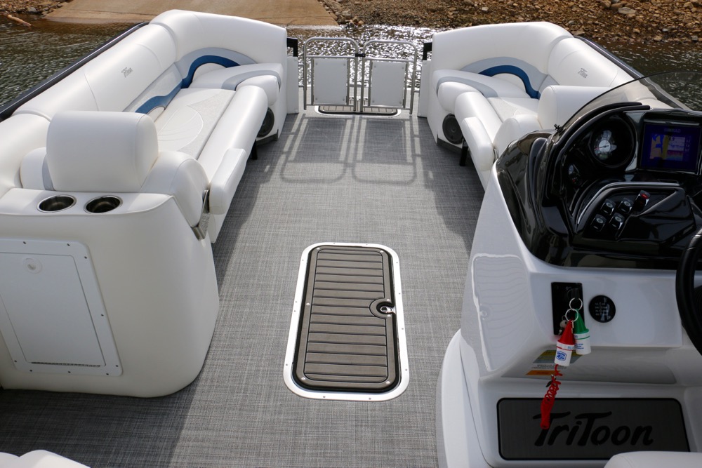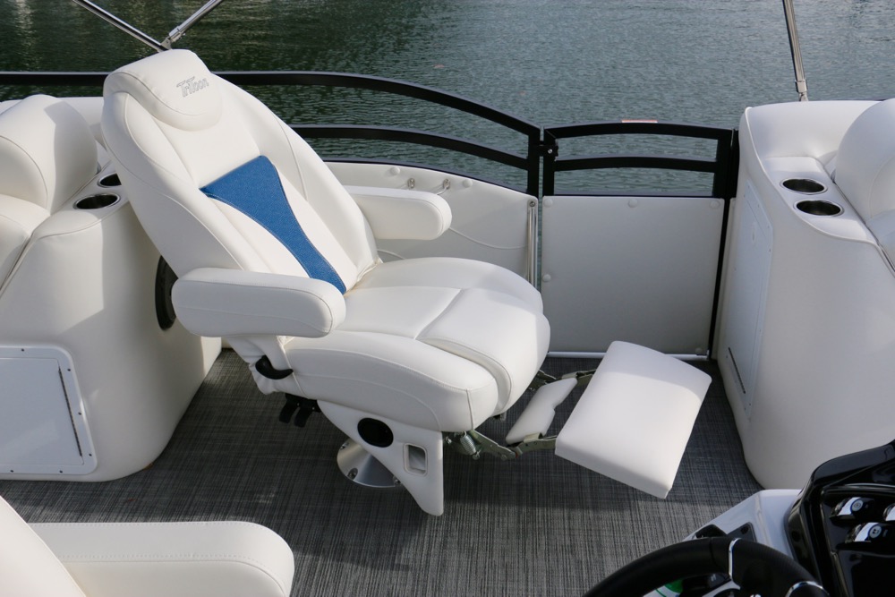 This new NepToon Sport TriToon features JC’s high-performance Sport Hull with hydro-performance fins, aluminum underskin, and power-assist hydraulic steering. On the topside, you’ll find JC’s new Dual Stern Lounge Seating! The perfect cruising and lounging configuration, with reclining captain’s chair with leg support on the port side and a reclining Captain’s chair with flip-up bolster behind the helm. Behind the twin Captain’s chairs, you’ll find 2 adjustable width rear-facing lounges to relax and watch the lake. This is also a great configuration to watch tubing, wake boarding and watersports behind the boat.