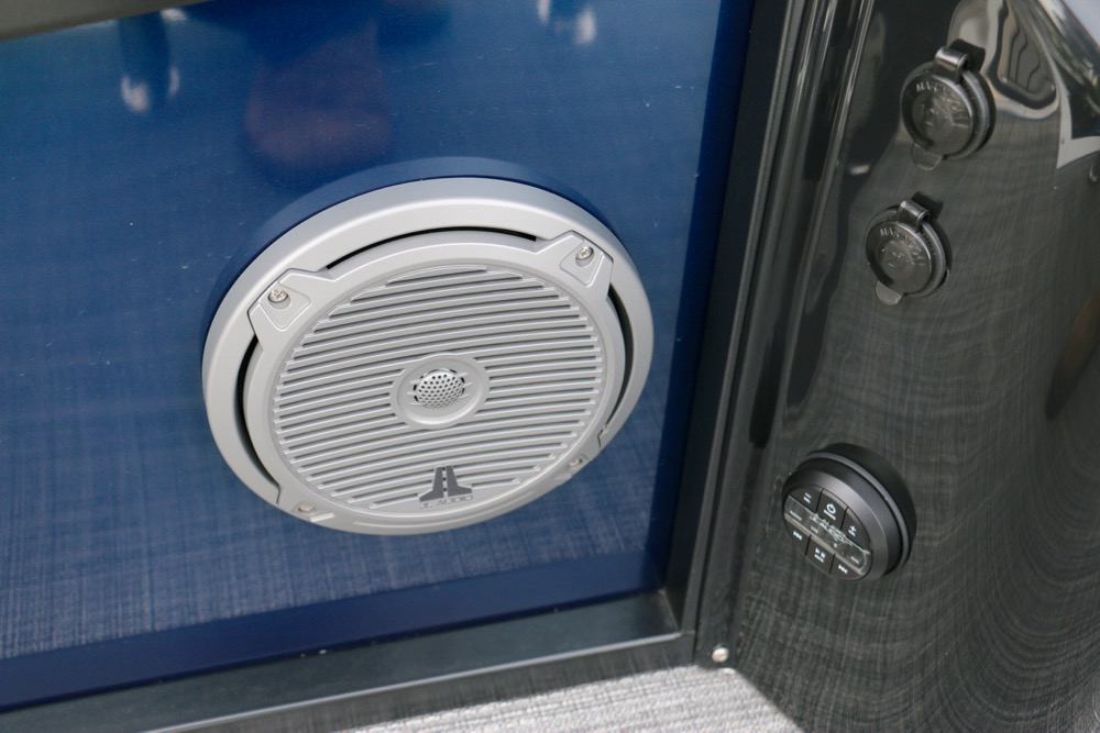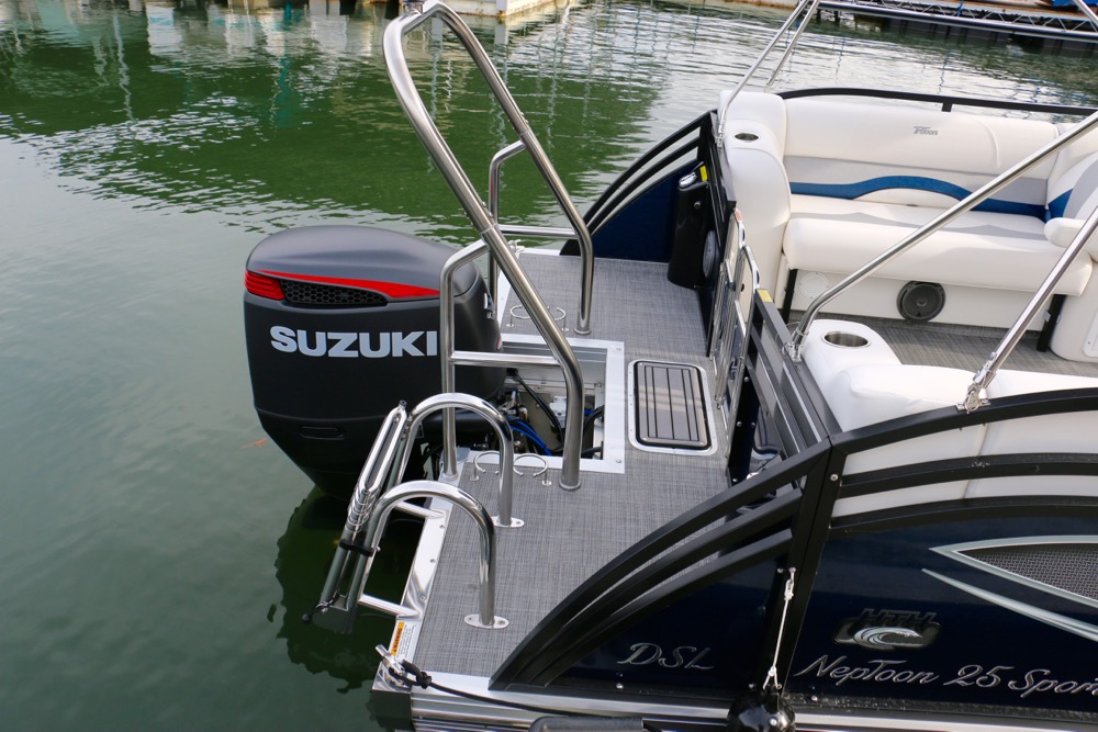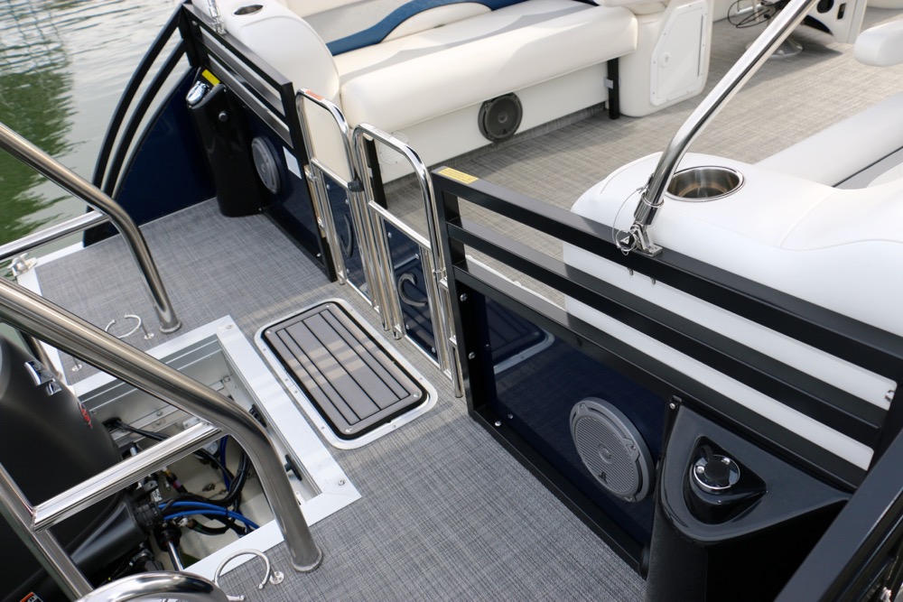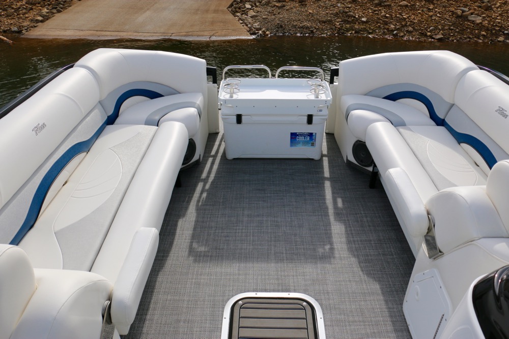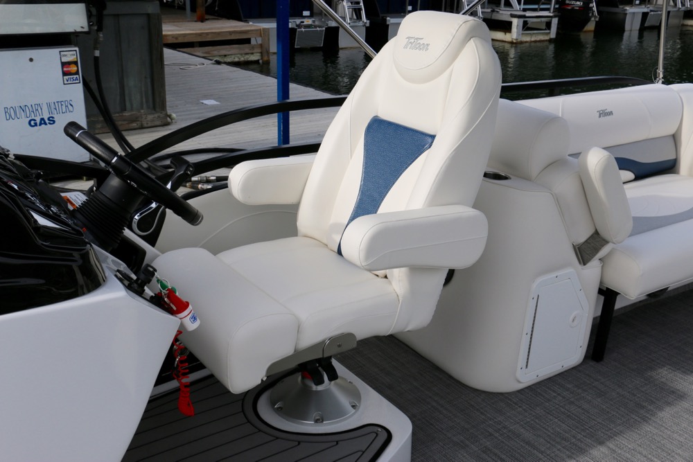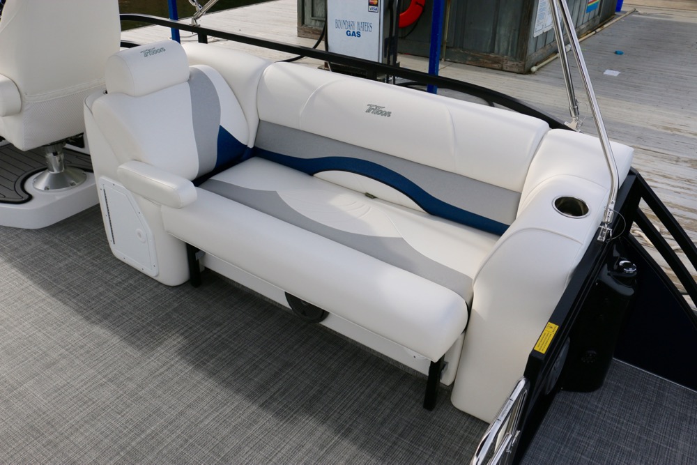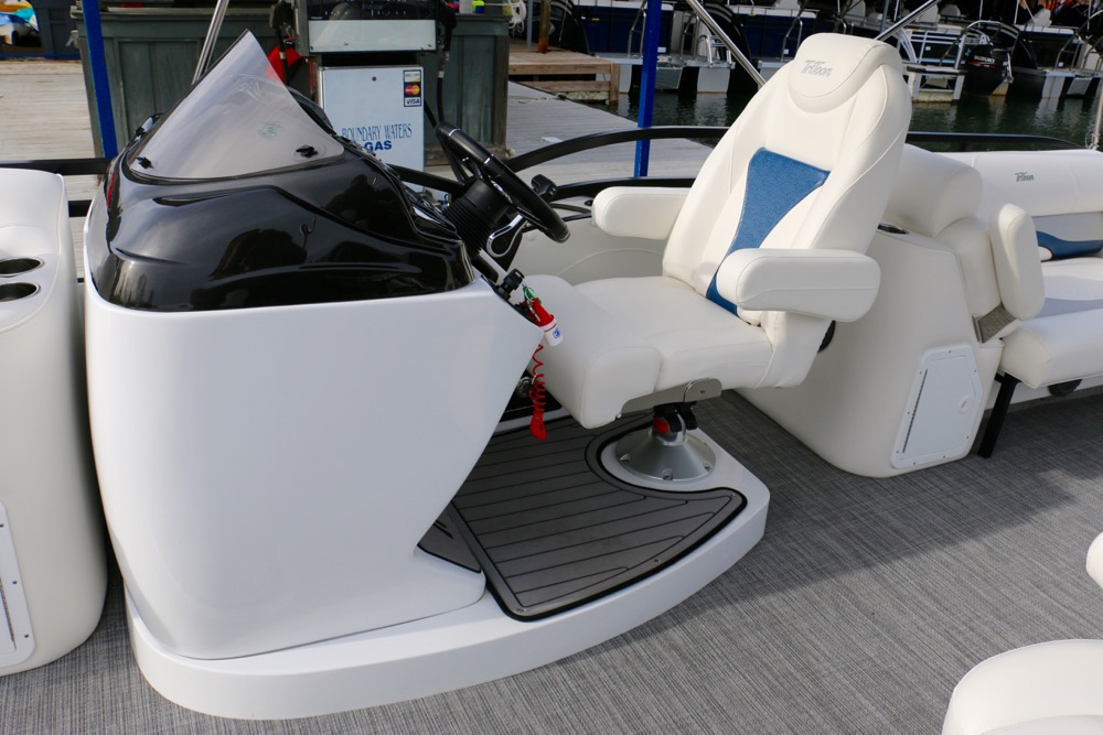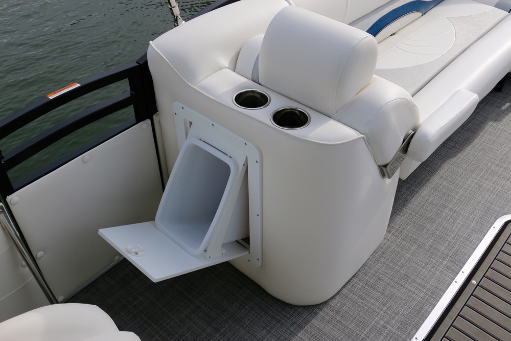 This new NepToon Sport TriToon features JC’s high-performance Sport Hull with hydro-performance fins, aluminum underskin, and power-assist hydraulic steering. On the topside, you’ll find JC’s new Dual Stern Lounge Seating! The perfect cruising and lounging configuration, with reclining captain’s chair with leg support on the port side and a reclining Captain’s chair with flip-up bolster behind the helm. Behind the twin Captain’s chairs, you’ll find 2 adjustable width rear-facing lounges to relax and watch the lake. This is also a great configuration to watch tubing, wake boarding and watersports behind the boat.