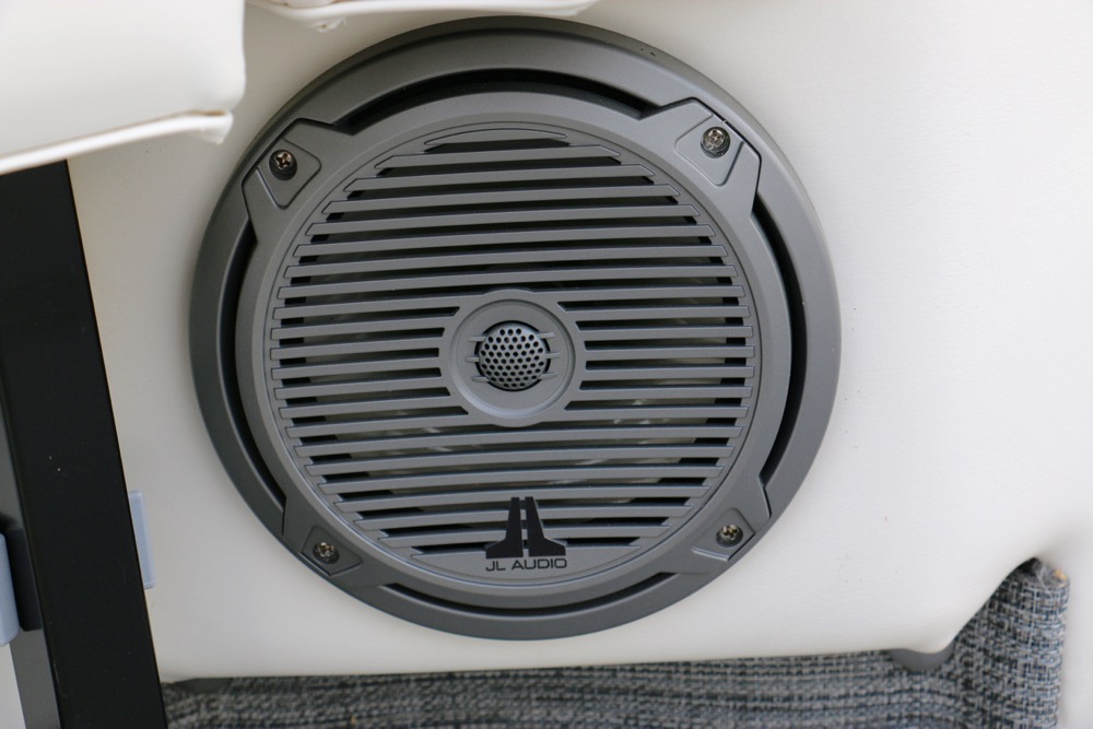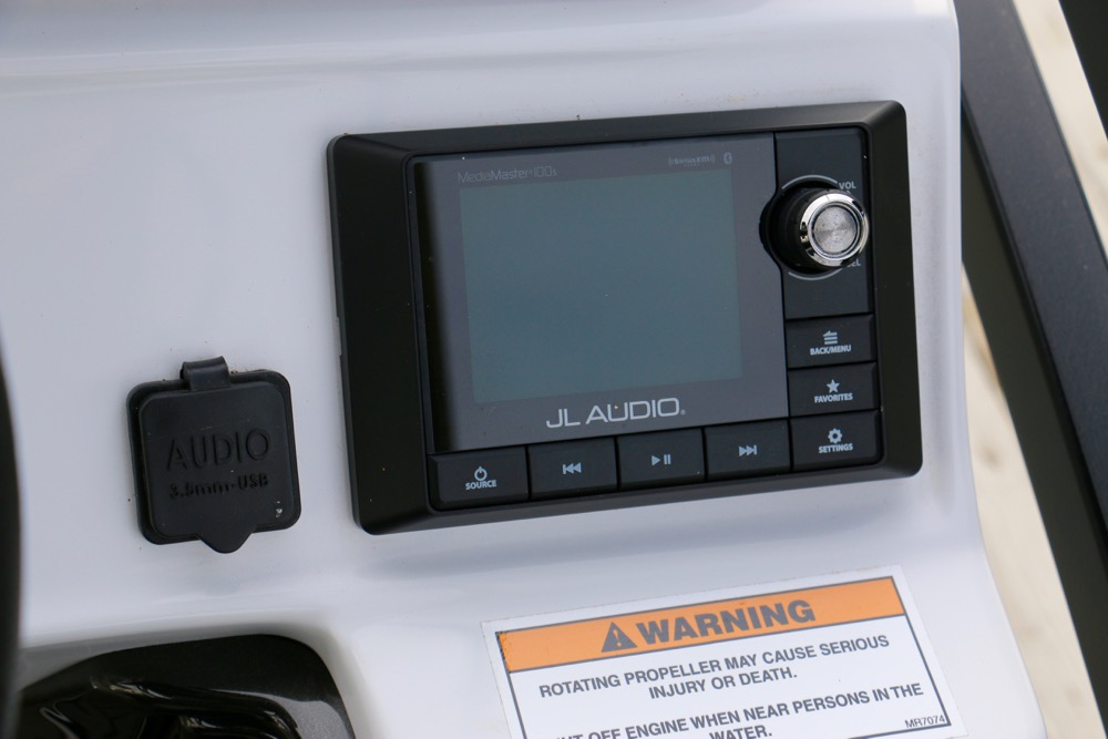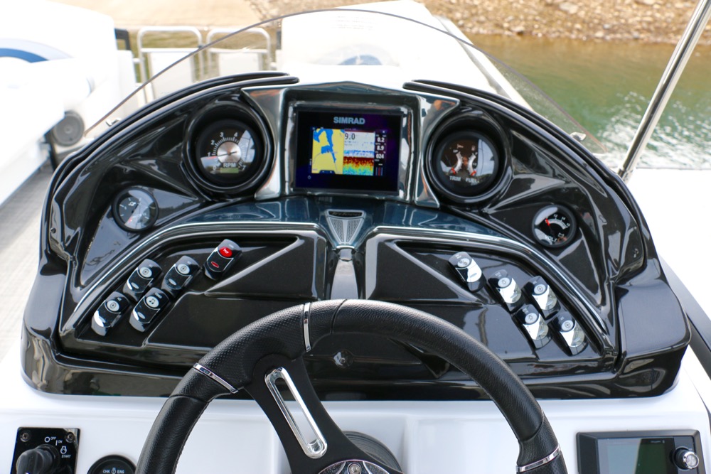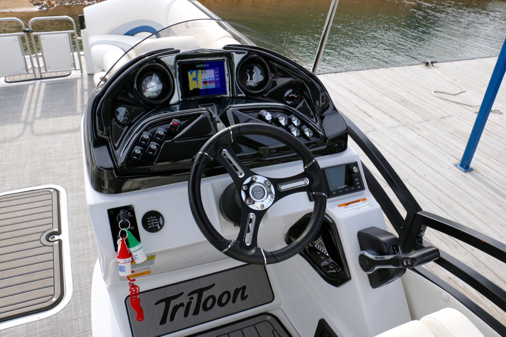 Features include: New Simrad S05 touchscreen color GPS/depth finder nested in-dash, JL Audio Media Master stereo with color display, bluetooth, transom remote control, 2 JL Audio Amps, (6) JL Audio 7.7 series speakers inside the boat with (2) additional JL aft deck speakers, USB & Aux. plugs, New power management system to efficiently optimize dual battery usage, New high-end upholstery exclusive to JC TriToon, Stainless Steel Arm-Rest Brackets, New Stitched “JC TriToon” Logos on the seats, Improved Stainless Steel gates, New Steering Wheel, Upgraded Upholstery Trim Package, Stainless Bow Anchor Cleat, and more.
