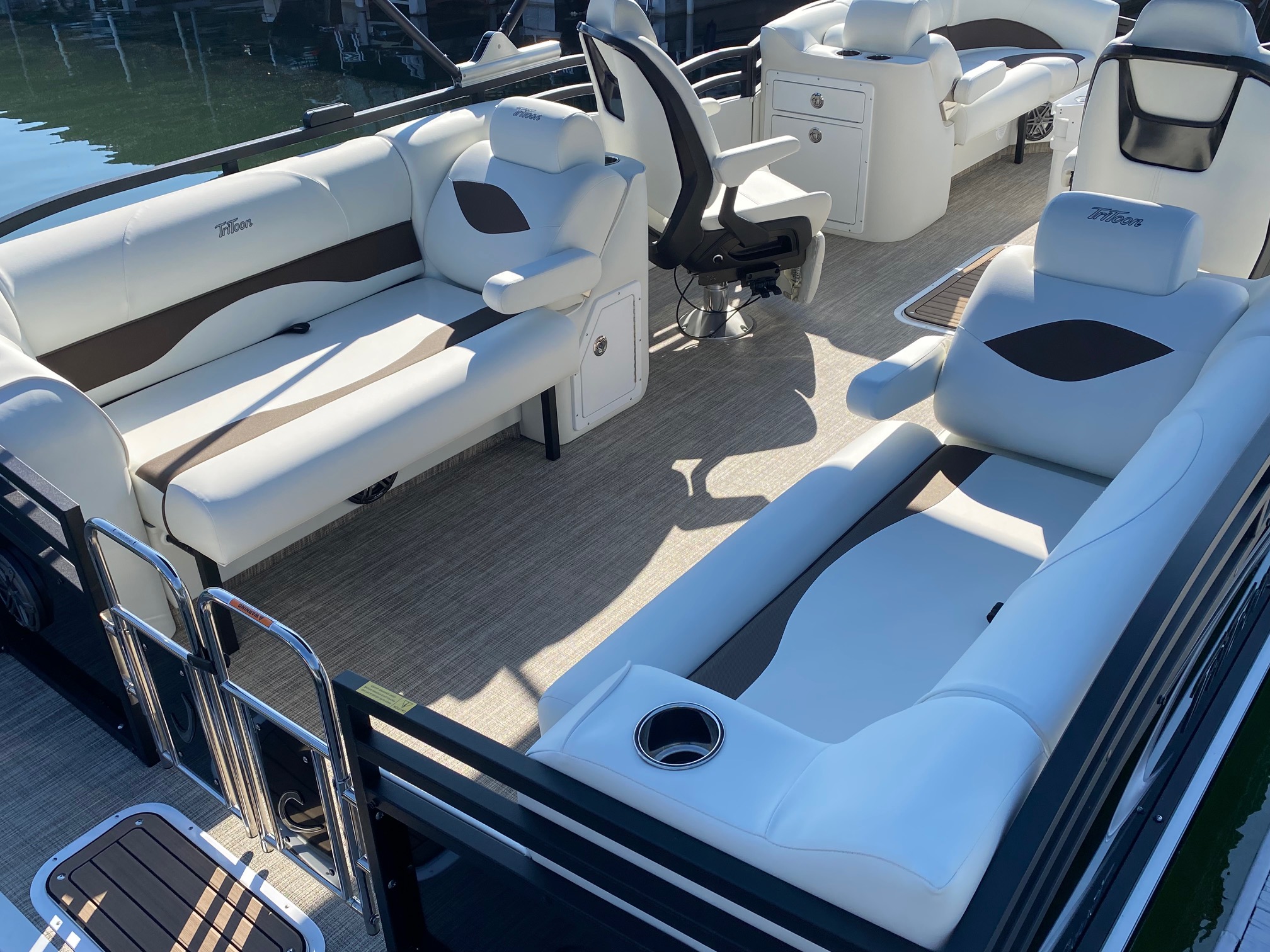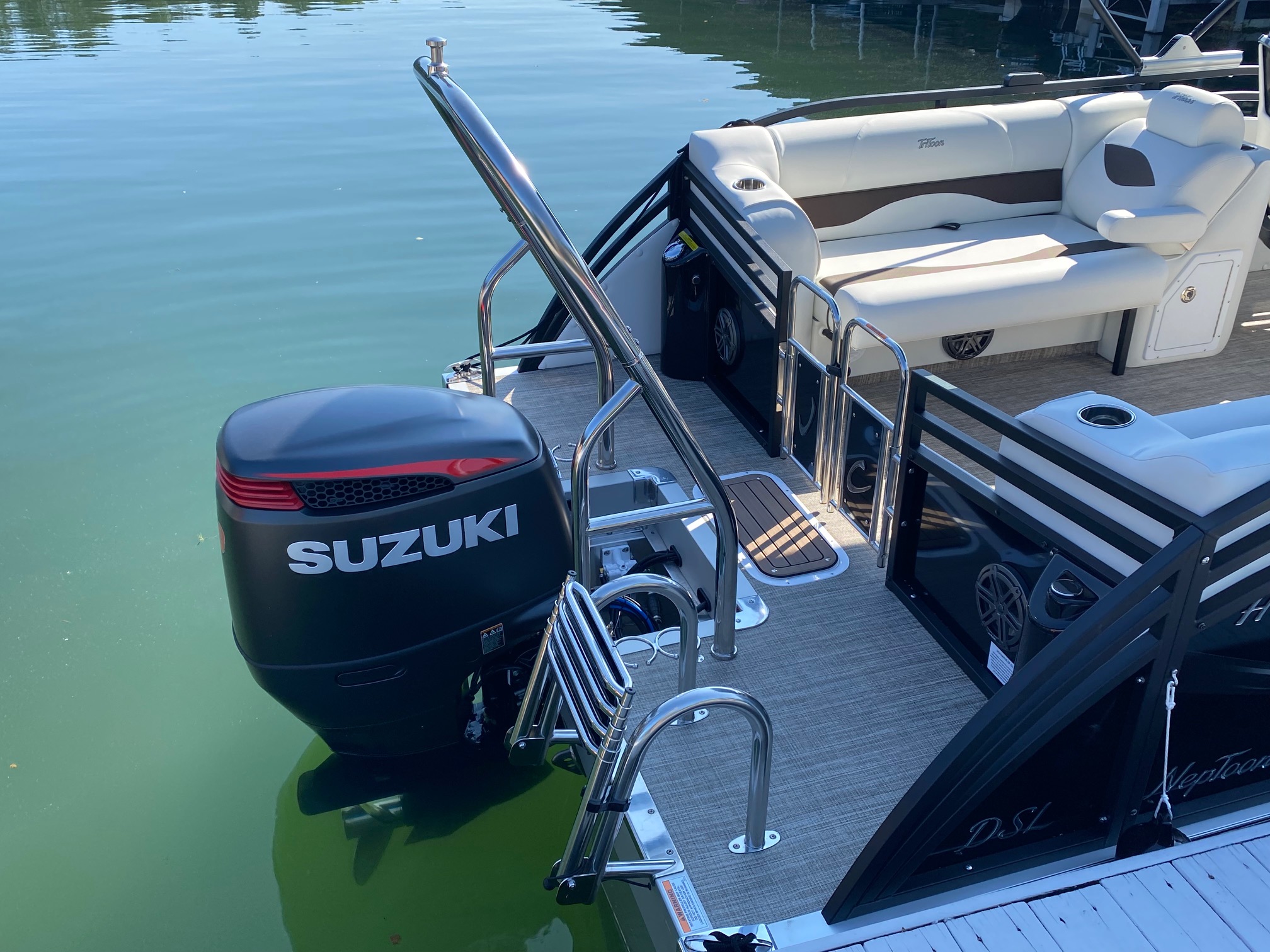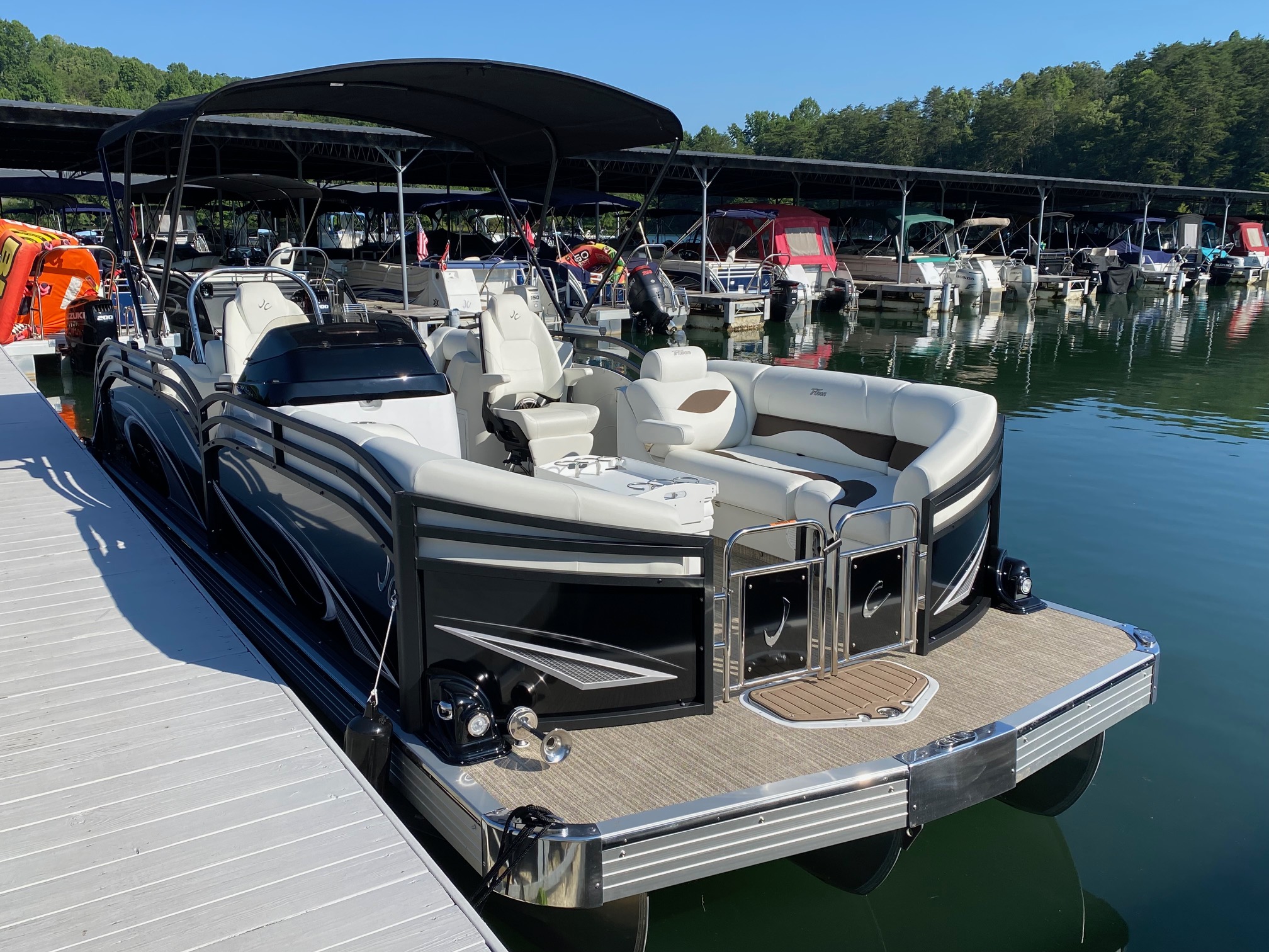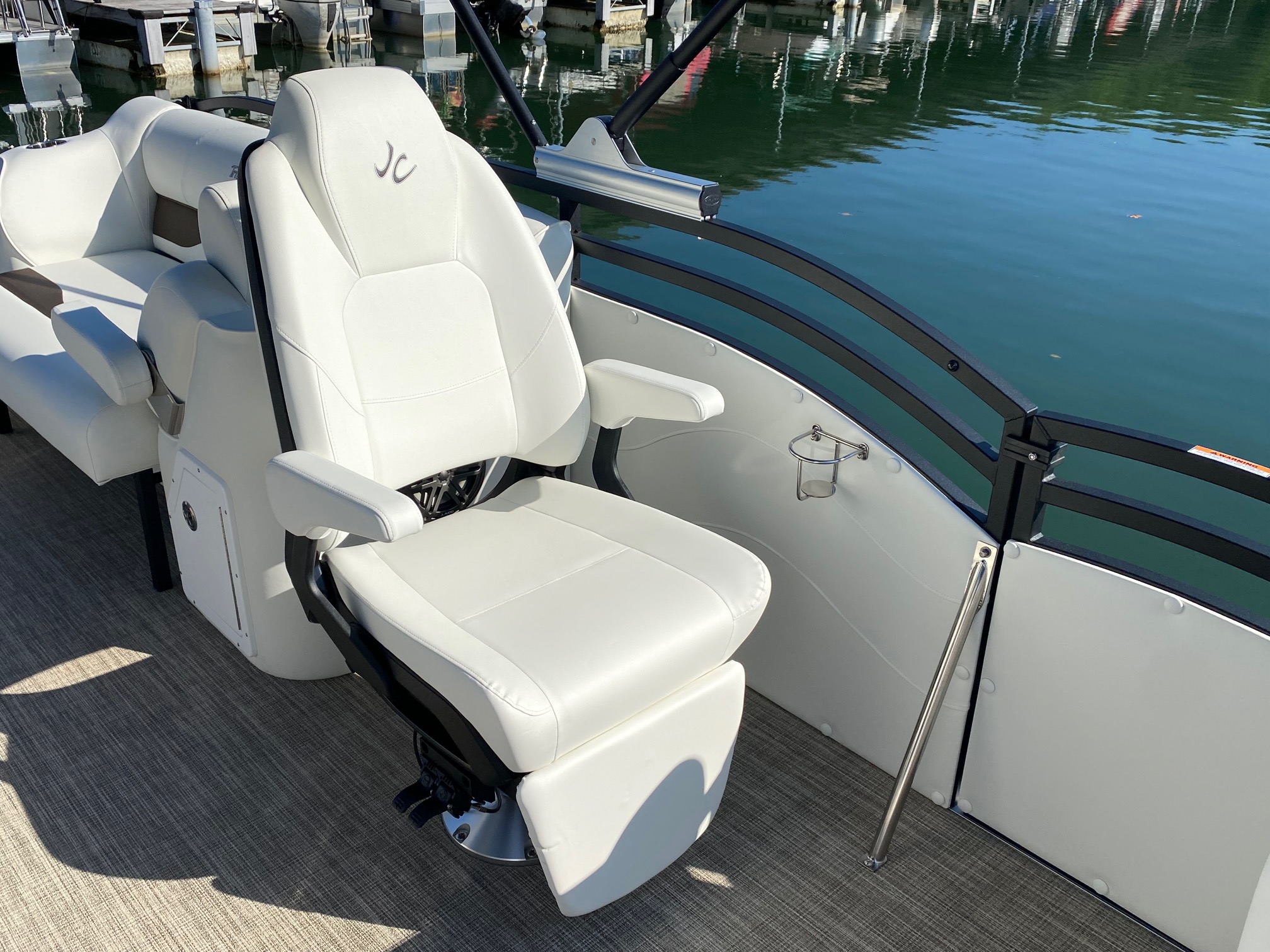 Other features include: JC’s TriToon Sport Hull with hydro-performance fins, aluminum underskin, and power-assist hydraulic steering, JL Audio Media Master stereo with color display, bluetooth, transom remote control, 2 JL Audio Amps, (6) JL Audio 7.7 series speakers inside the boat with (2) additional JL aft deck speakers, USB & Aux. plugs, New power management system to efficiently optimize dual battery usage, New high-end upholstery exclusive to JC TriToon, Stainless Steel Arm-Rest Brackets, New Stitched “JC TriToon” Logos on the seats, Improved Stainless Steel gates, New Steering Wheel, Upgraded Upholstery Trim Package, Stainless Bow Anchor Cleat, and more.