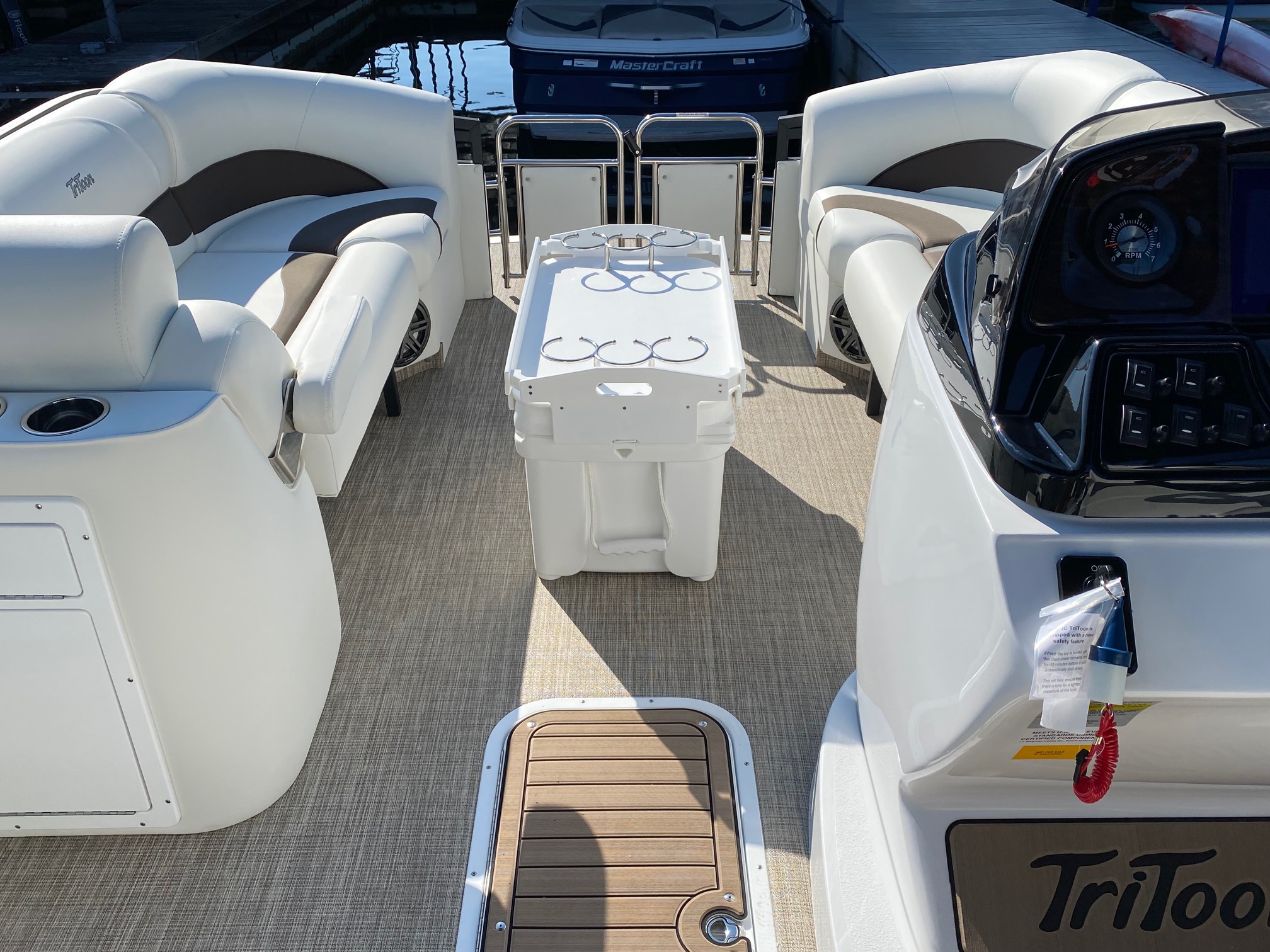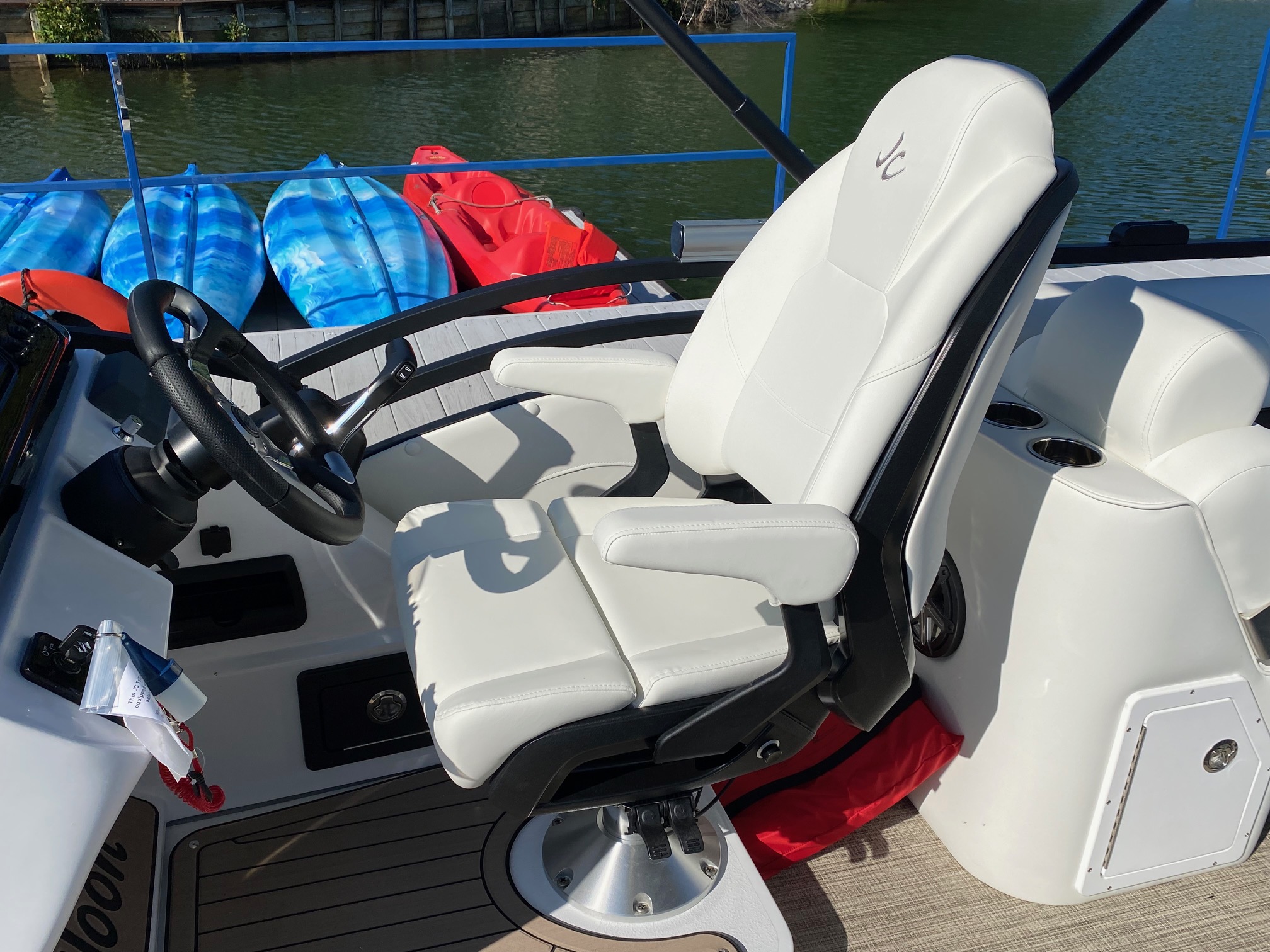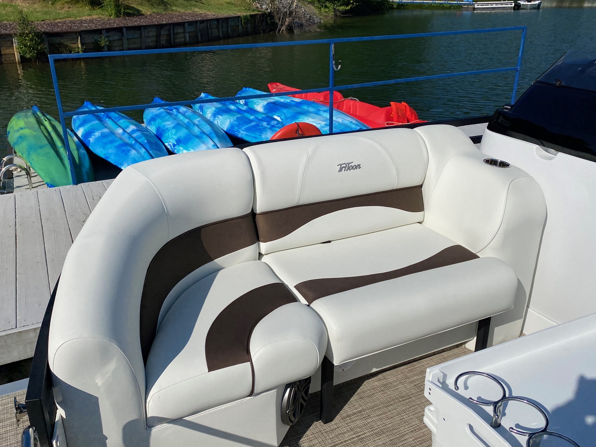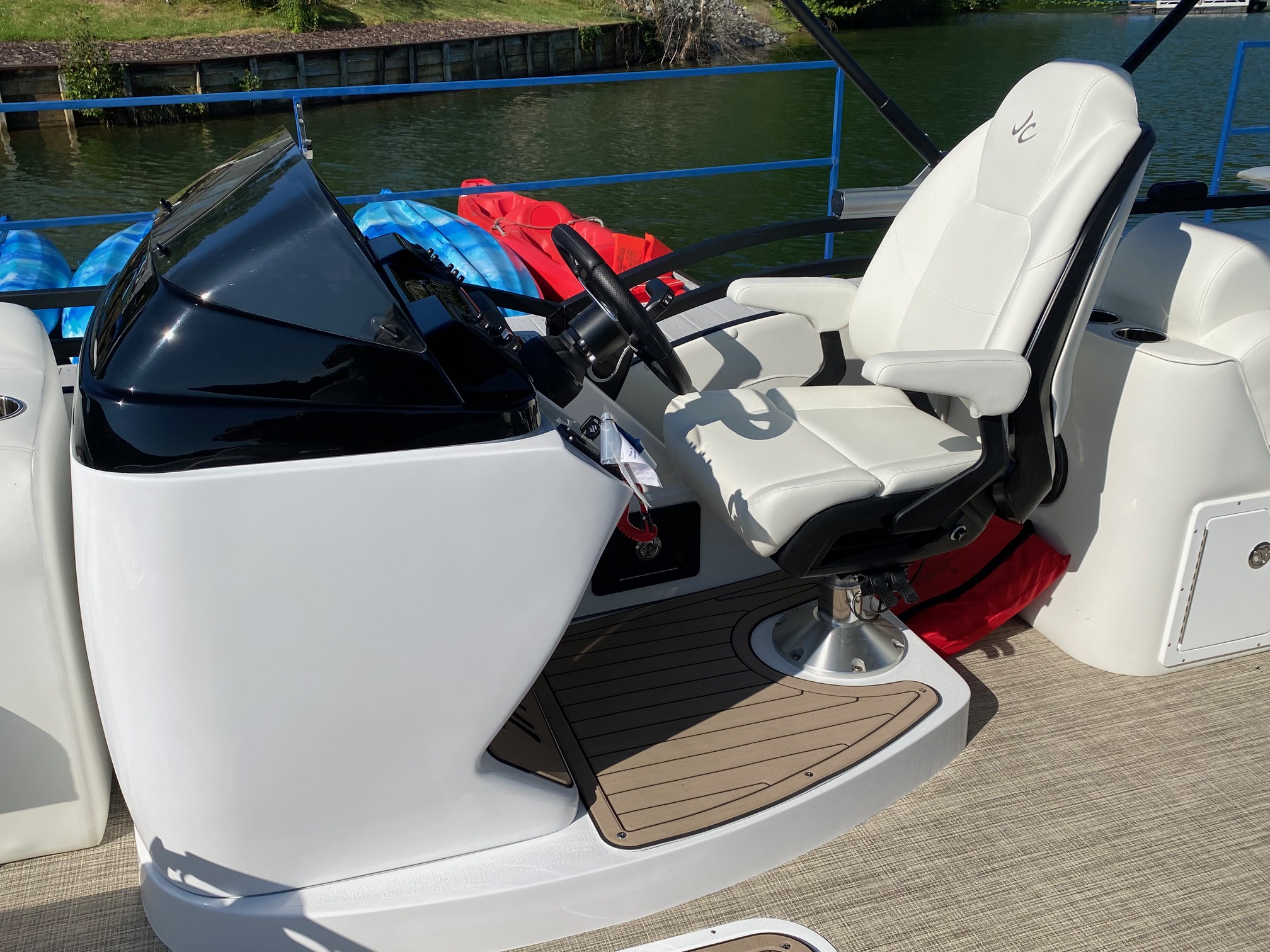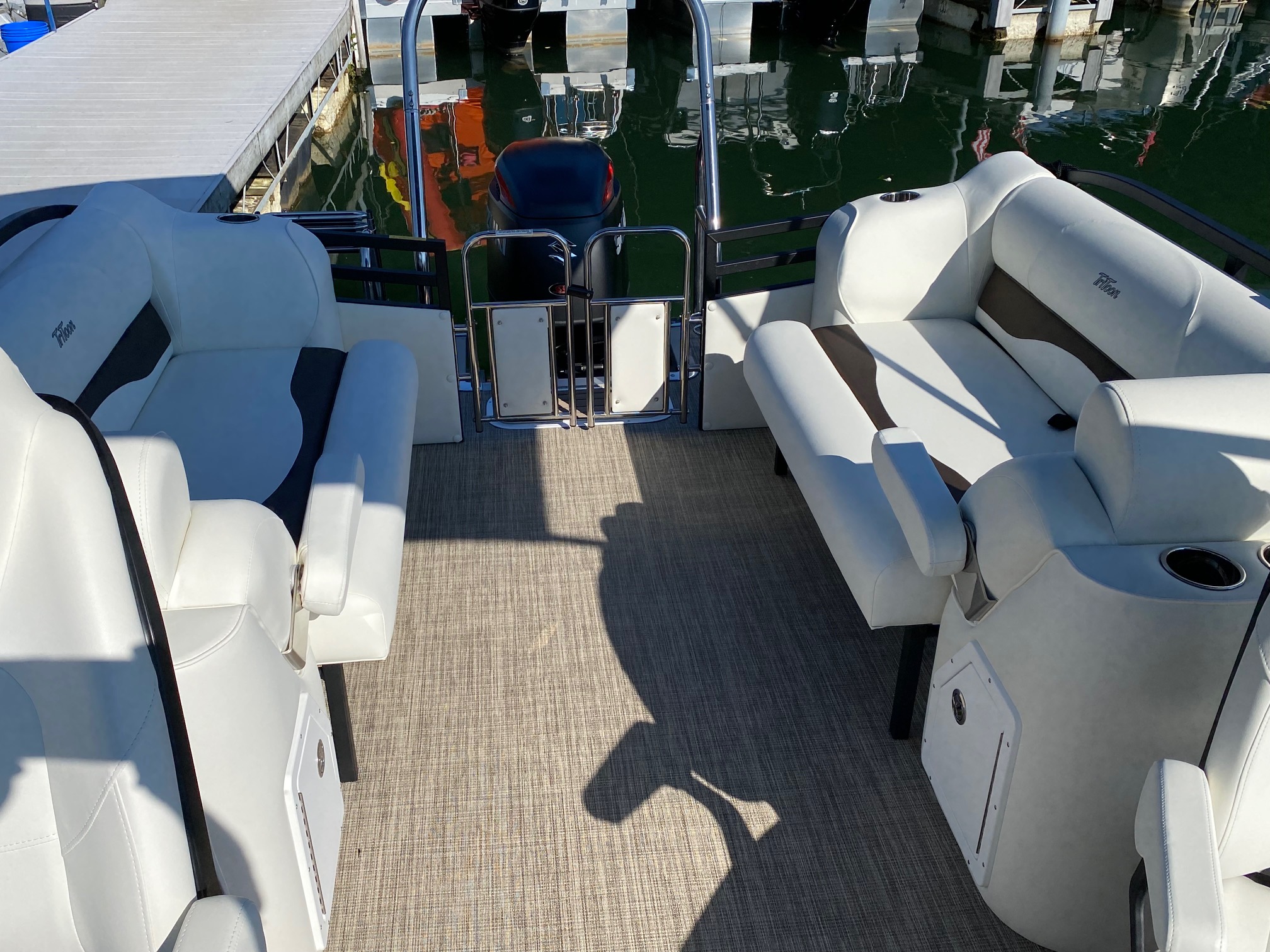 Other features include: JC’s TriToon Sport Hull with hydro-performance fins, aluminum underskin, and power-assist hydraulic steering, JL Audio Media Master stereo with color display, bluetooth, transom remote control, 2 JL Audio Amps, (6) JL Audio 7.7 series speakers inside the boat with (2) additional JL aft deck speakers, USB & Aux. plugs, New power management system to efficiently optimize dual battery usage, New high-end upholstery exclusive to JC TriToon, Stainless Steel Arm-Rest Brackets, New Stitched “JC TriToon” Logos on the seats, Improved Stainless Steel gates, New Steering Wheel, Upgraded Upholstery Trim Package, Stainless Bow Anchor Cleat, and more.
