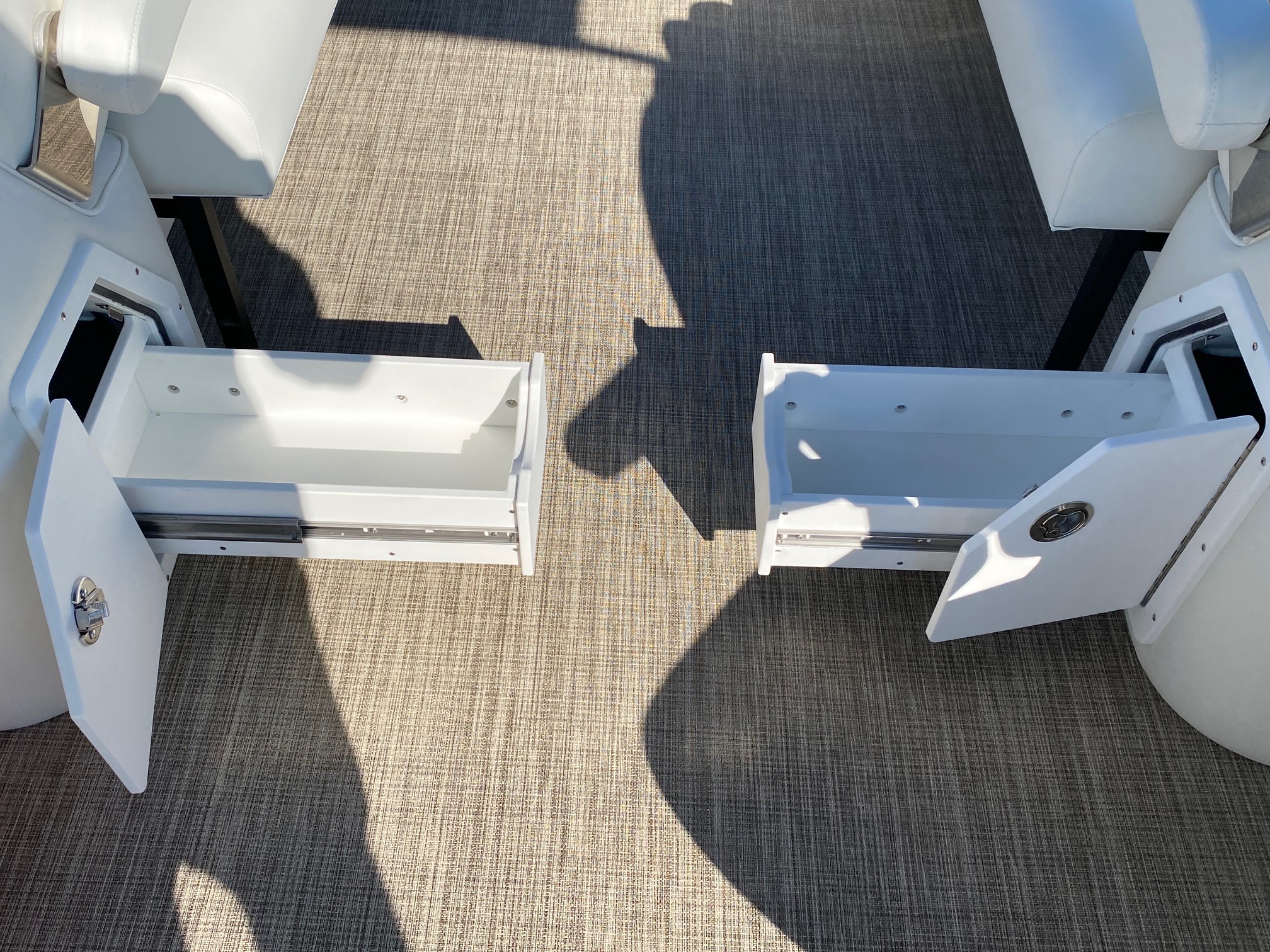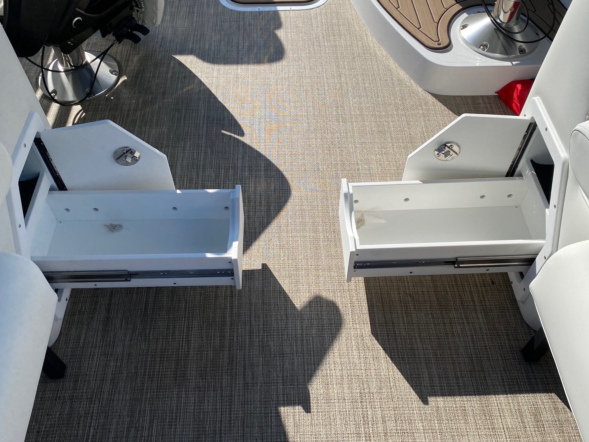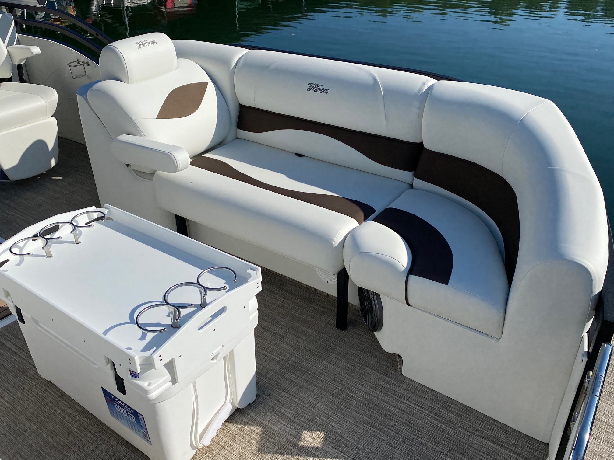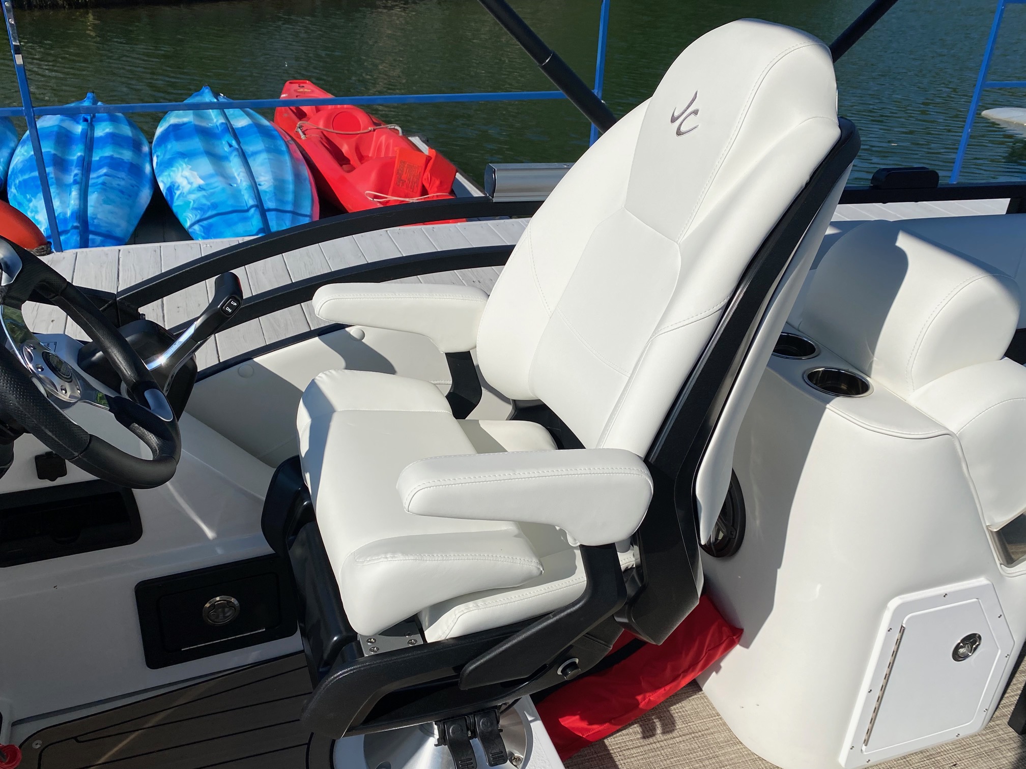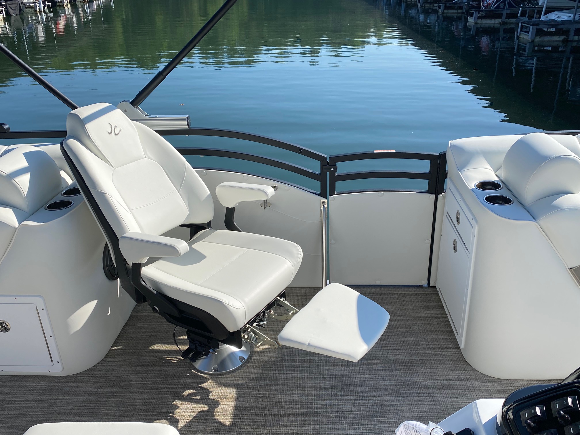 On the topside, you’ll find JC’s Dual Stern Lounge Seating! The perfect cruising and lounging configuration, with reclining captain’s chair with leg support on the port side and a reclining Captain’s chair with flip-up bolster behind the helm. Behind the twin Captain’s chairs, you’ll find 2 adjustable width rear-facing lounges to relax and watch the lake.  This is also a great configuration to watch tubing, wake boarding and watersports behind the boat.
