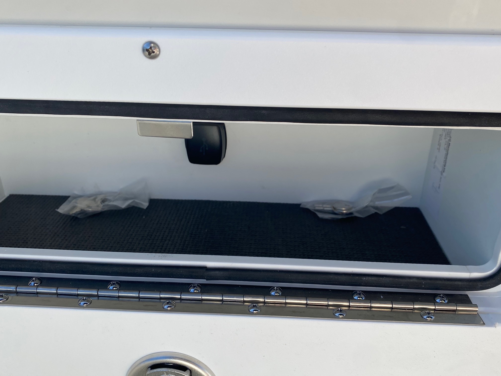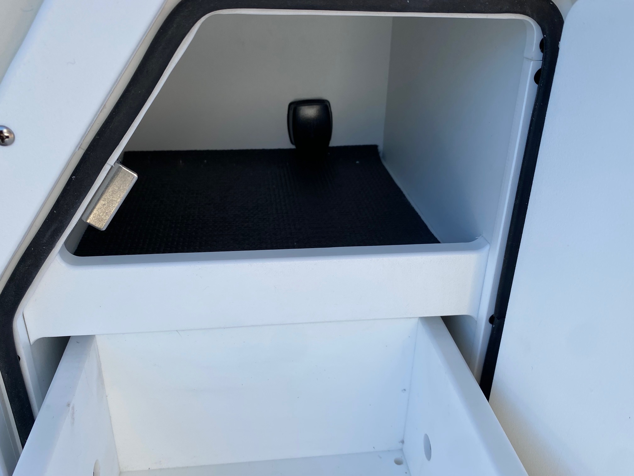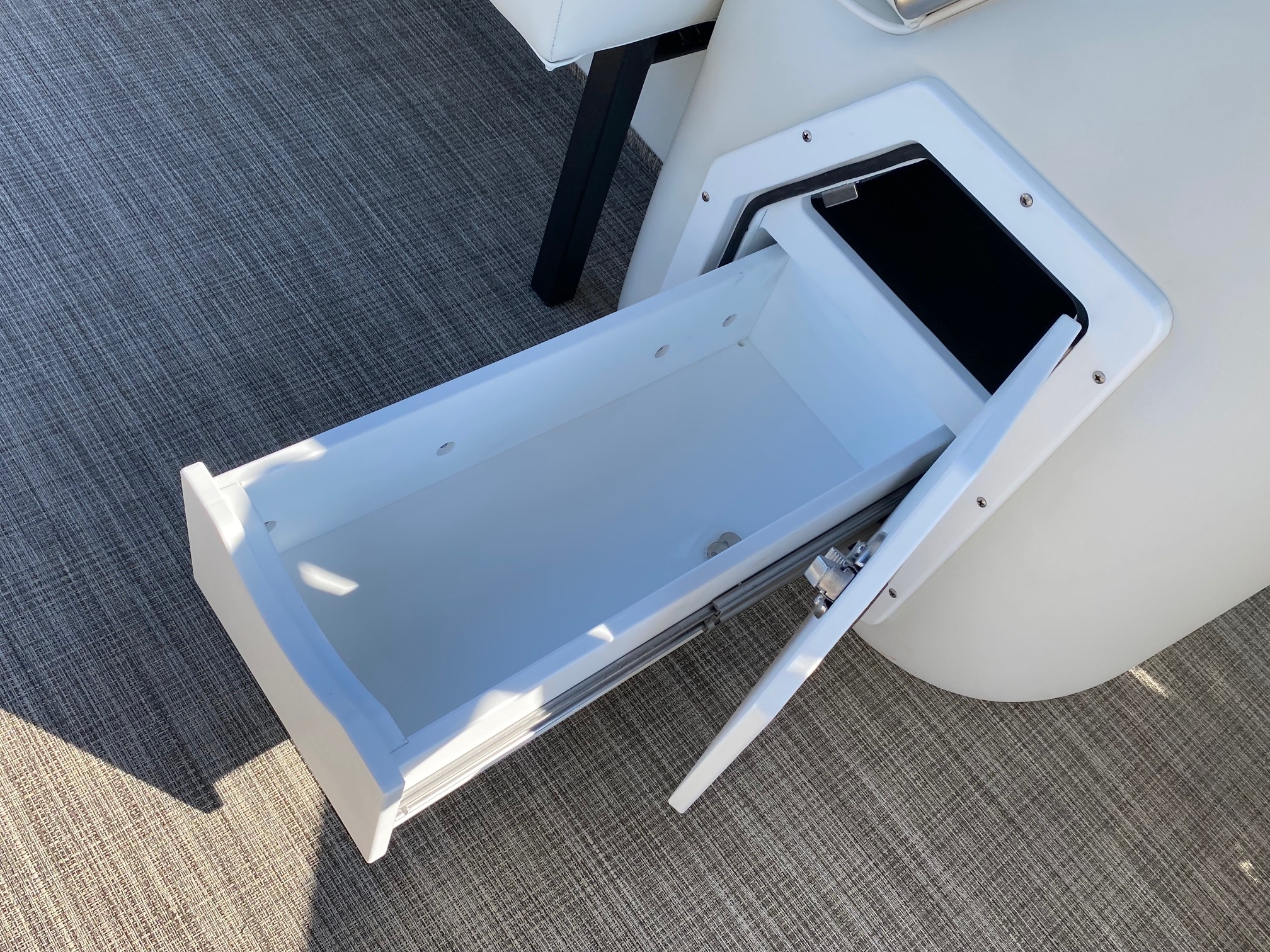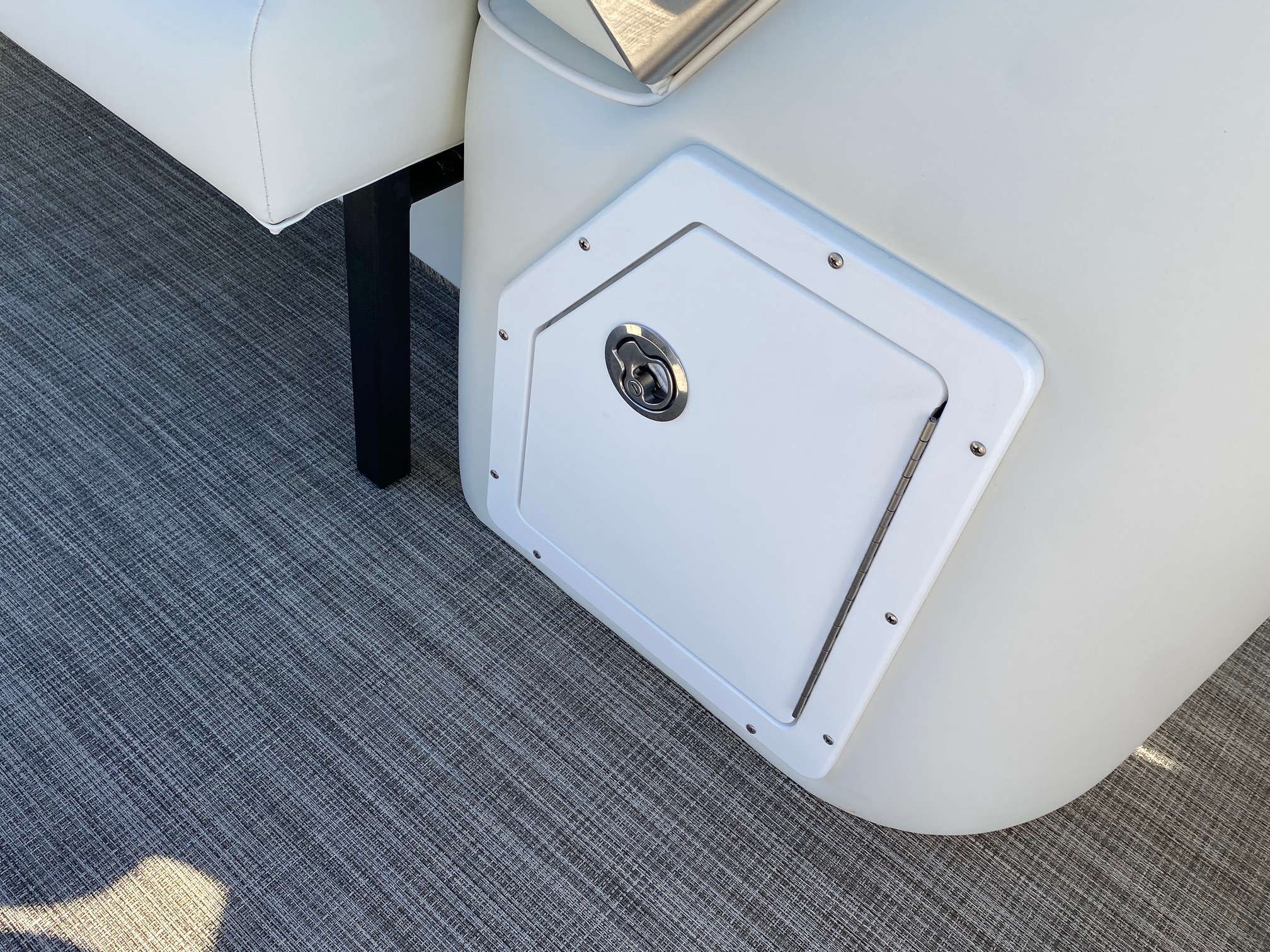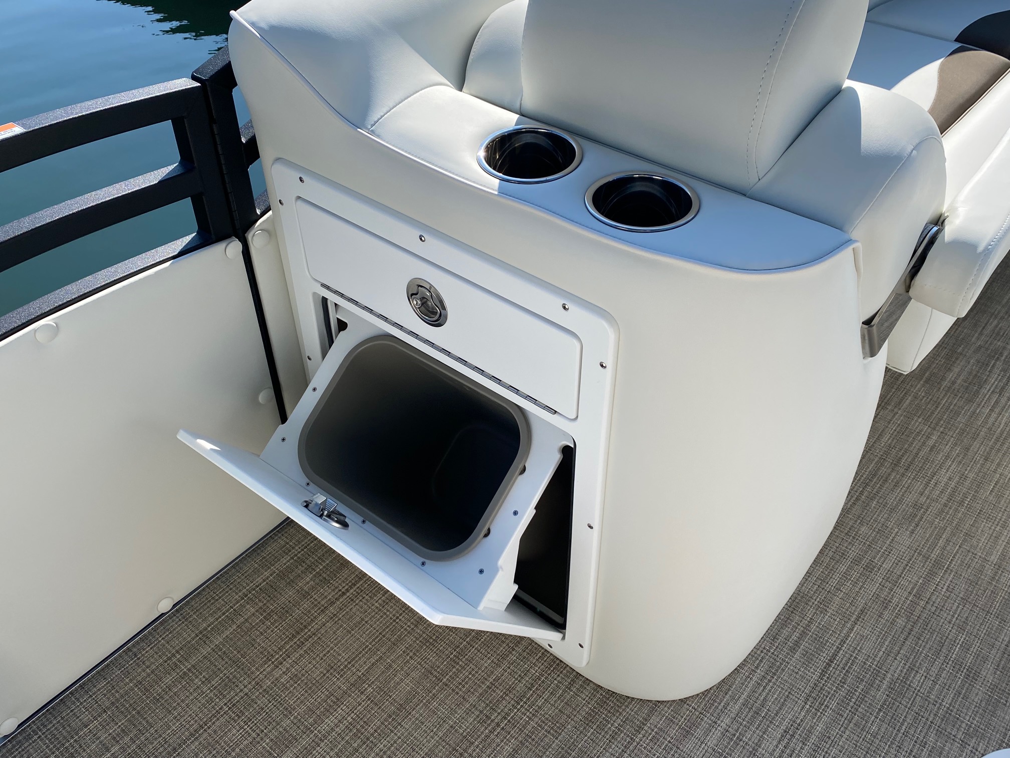 New 2024 Features:  9″ Simrad color GPS/depth finder/fish finder nested in the newly redesigned helm, all new rail pack design, new and improved Captain’s chair with flip-up bolster, wireless cell phone charging station in the helm next to throttle, New lounger storage with slide-out drawer and USB charging shelf on both rear lounges, New lounger with trash container and lockable USB charging shelf storage, New High Tide Hull rubrail design, New textured powder coating on the rail pack, and improved Nouveau accent upholstery.