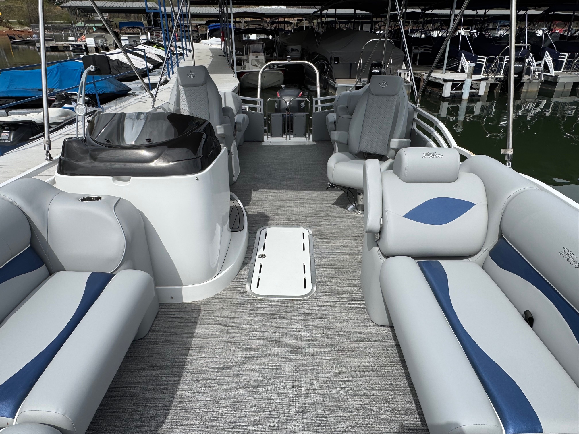 Come experience the most premium TriToon rental boat in North Georgia!  Our 24′ JC Sport Sport Pontoon Rental features a V6 Suzuki 250 hp fuel-efficient 4-stroke engine, JC’s  high-performance TriToon Sport hull for improved speed and handling, and power-assist hydraulic steering for easy driving and control.  The seating configuration offers dual Captain’s chairs, longer bimini shade, and dual stern lounges to cruise and relax all day!  It’s great for a day of cruising and exploring or an exciting day of watersports pulling a tube. Features include a JL Audio Bluetooth Stereo, Sunbrella custom bimini for shade, Garmin Color Fish & Depth Finder, Heavy Duty tow bar for tubing, anchor winch, reclining Captain’s Chair, premium Seagrass flooring, and seating for 12 passengers. We offer our extreme double tube for rent with these sport pontoon boats.  Other towing (skis, wakeboard, etc.) are not allowed with this boat.  Get your Double Tube rental for FREE when you rent this boat for 3 or more days!